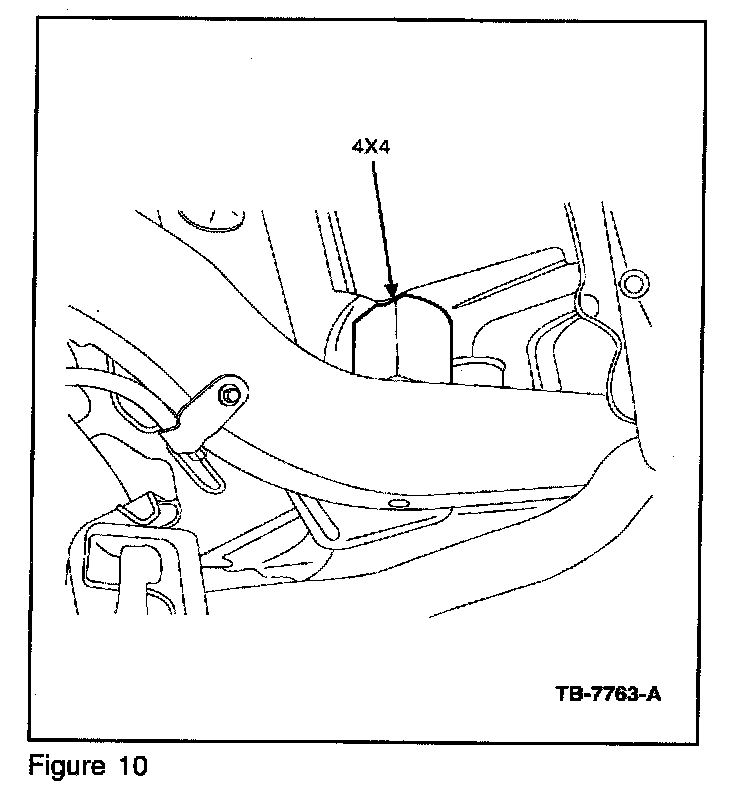 4. Remove the wood block between the frame and the body mounts at the # 5 body mount location on each side of the vehicle (Figure 10). It may be necessary to further lower the hoist by 6 to 12 mm (1/4" to 1/2").
