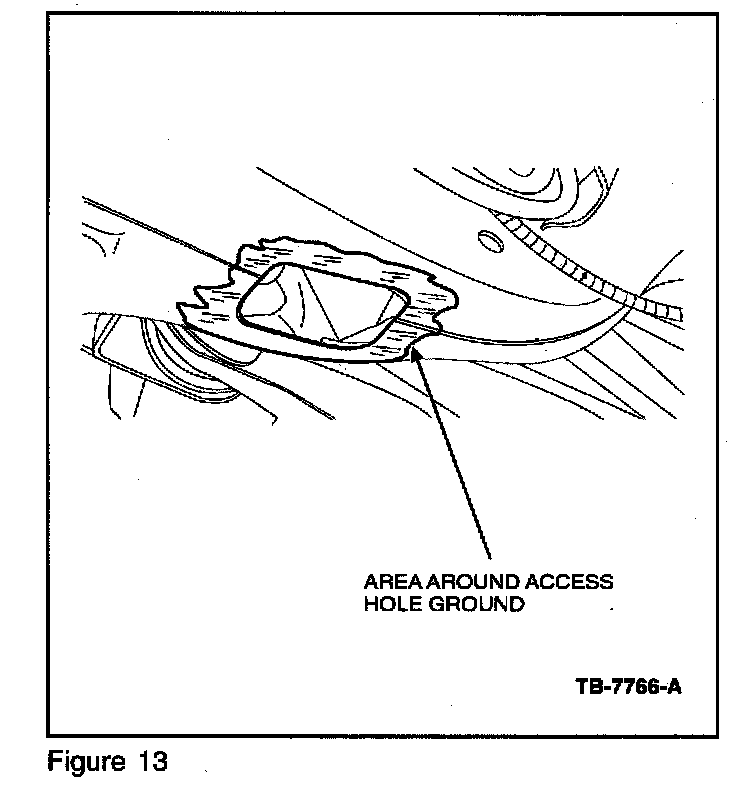 7. Grind the area around the access hole in the bottom of the frame at the trailing arm, including any welds that may have been added to repair cracks. Grind any welds where needed for proper location of the reinforcement patch (Figure 13). Do not grind away the parent metal. The reinforcement plate must be located flush to the frame.