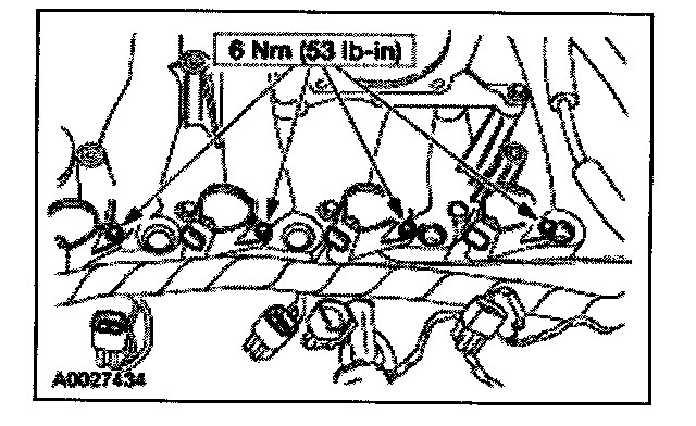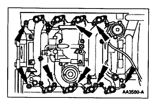 57. Install the intake manifold and hand-tighten the bolts at the locations shown.