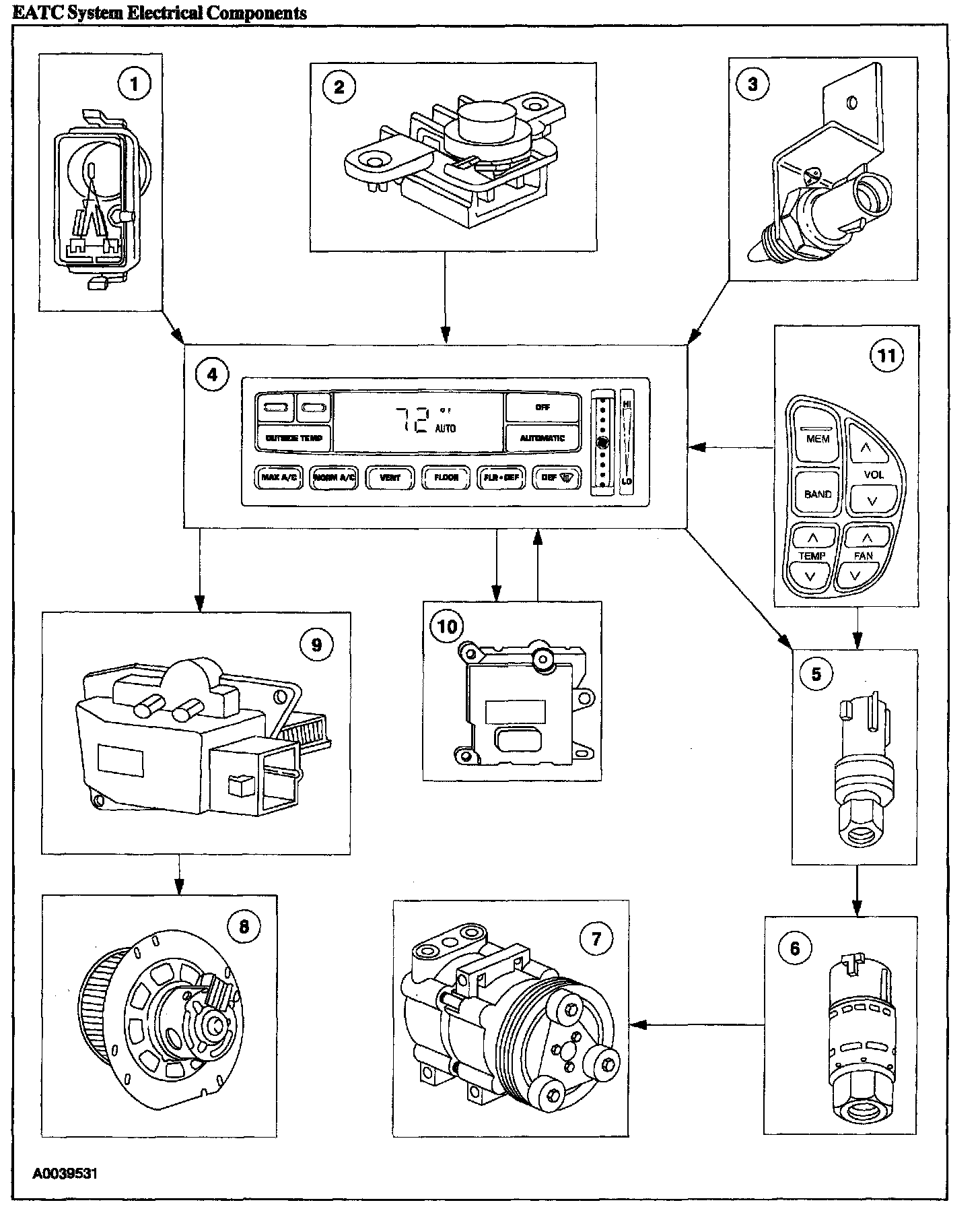 - The floor/defrost door vacuum control motor is at full vacuum and the panel door vacuum control motor is at no vacuum, directing airflow to the floor duct.