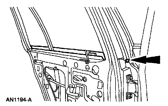 CAUTION: Do not attempt to forcibly remove the rivets as damage to the rear door window glass may result. Prior to removing the rivet center pins, it is necessary to place a suitable block support between the door outer panel and the rear door window channel bracket to stabilize the rear door window glass during rivet removal.