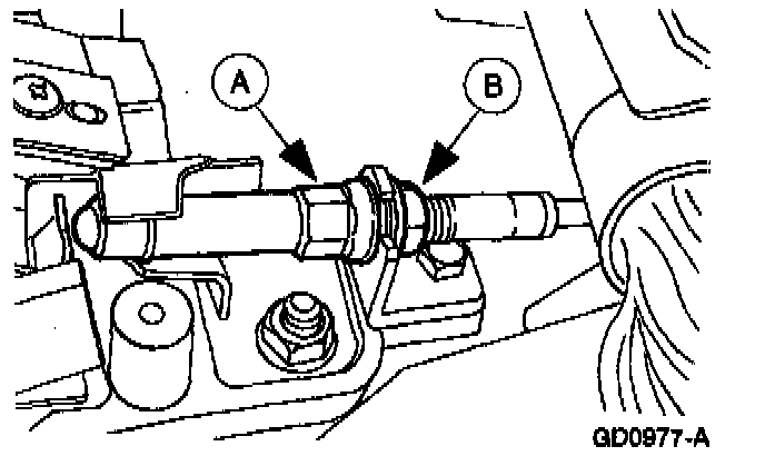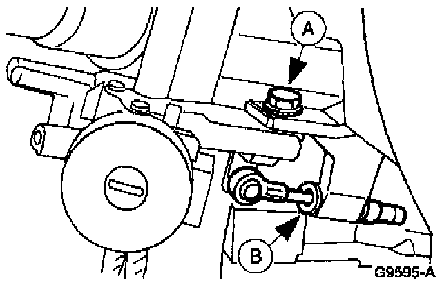 Hold the (A) ignition/shifter interlock cable locknut to prevent it from turning while loosening the (B) ignition/shifter interlock cable locknut and position the cable aside.