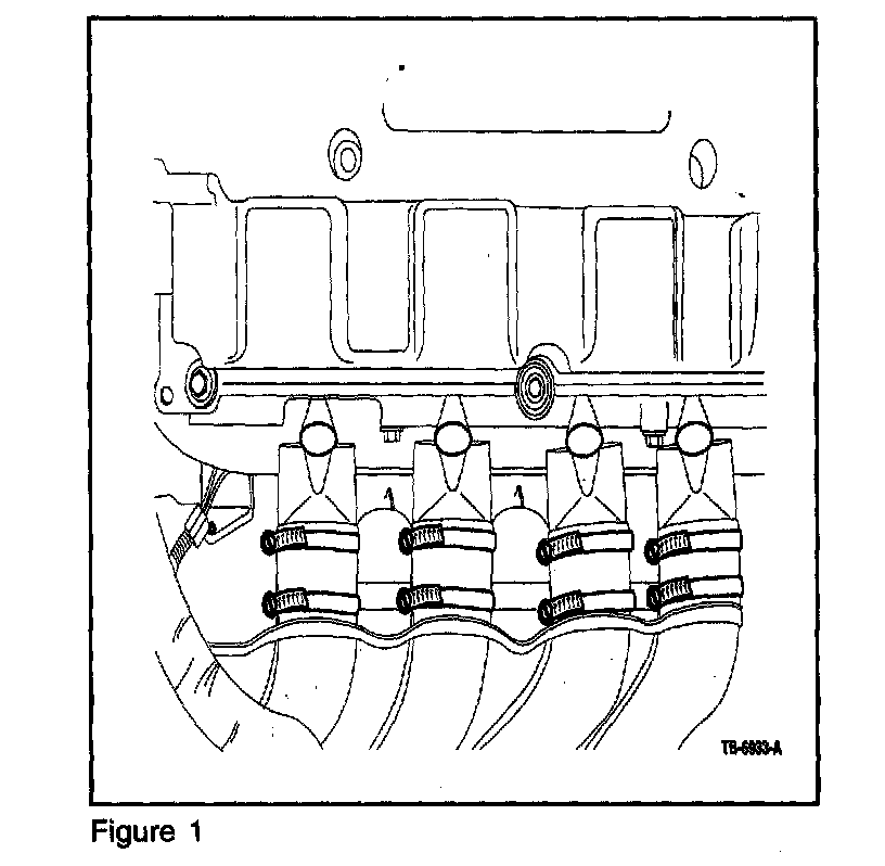 2. Replace the boot clamps. Remove the fuel rail as described in Workshop Manual Section 303-04C - Fuel Injection Supply Manifold (remove fuel rail and injectors as one unit, ensuring that no dirt contaminates the sealing surfaces or gets into the intake ports. Replace the injector O-rings.