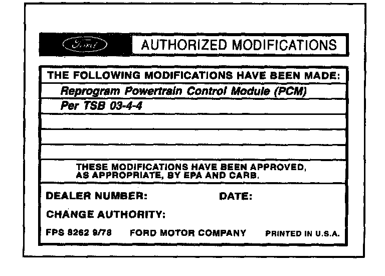 Obtain an Authorized Modifications Decal (FPS 8262 - obtainable through DOES II, 25/pkg) and list the date, dealer number, and summary of modifications performed. Select a prominent place adjacent to the Vehicle Emission Control Information Decal suitable for installing the Authorized Modifications Decal. Clean the area, install the decal, and cover it with a clear plastic decal shield.
