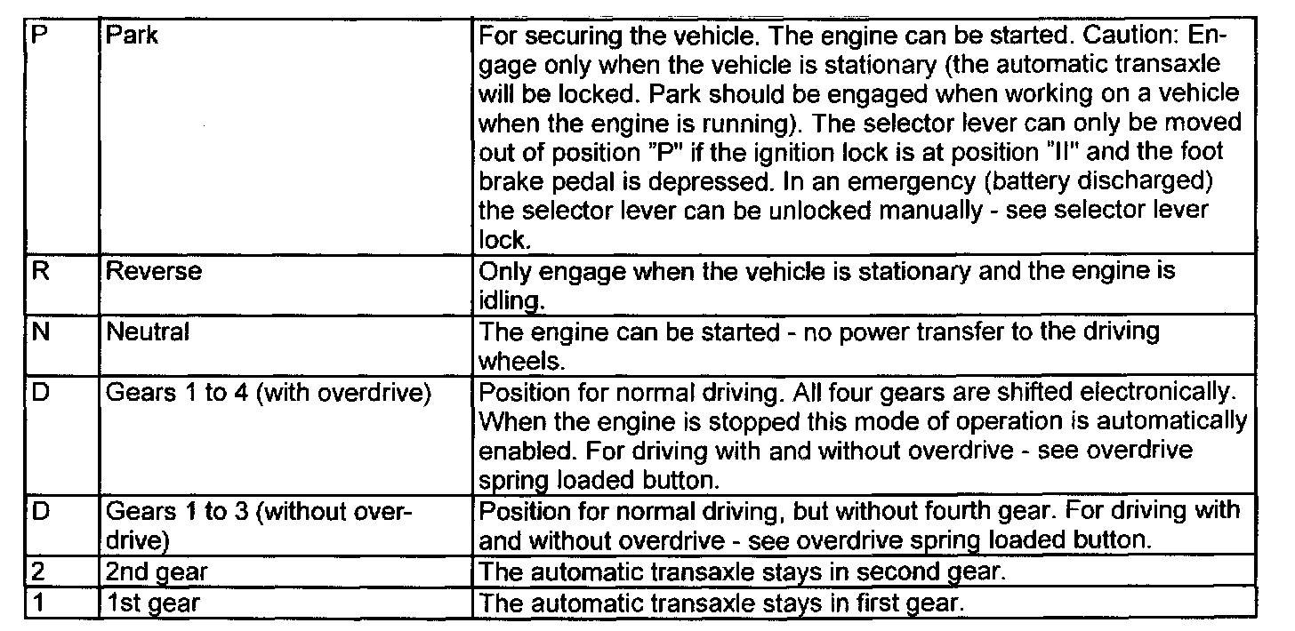 - To move the selector lever from park position, the ignition lock must be set to"11", the foot brake pedal must be depressed and shift release button pressed in.