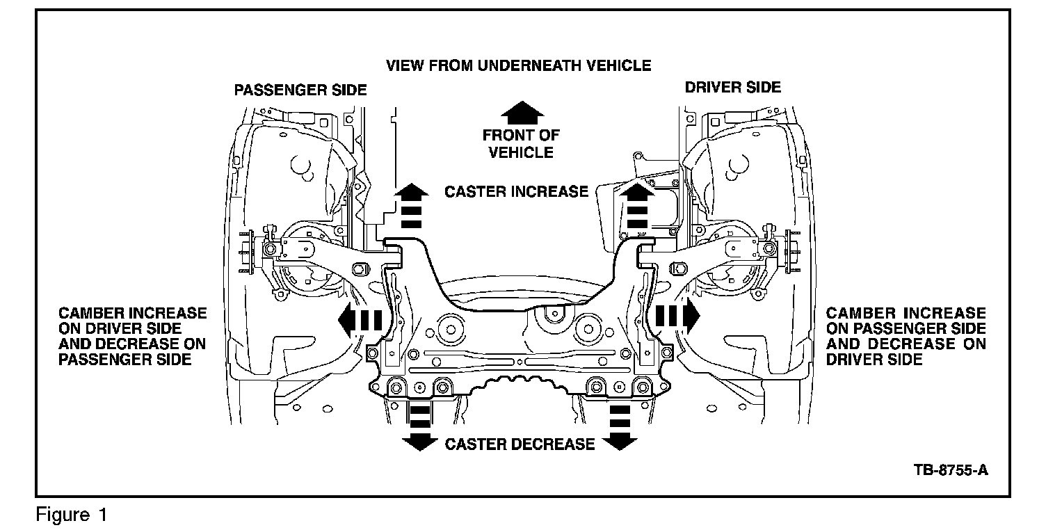1. After vehicle alignment checks have determined that the vehicle subframe is misaligned, determine which direction the subframe may need to be shifted to optimize camber and caster angles. (Figure 1)