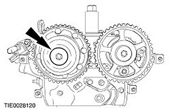 14. NOTE: Use an open ended wrench or suitable locking pliers to prevent the camshaft rotating from rotating.