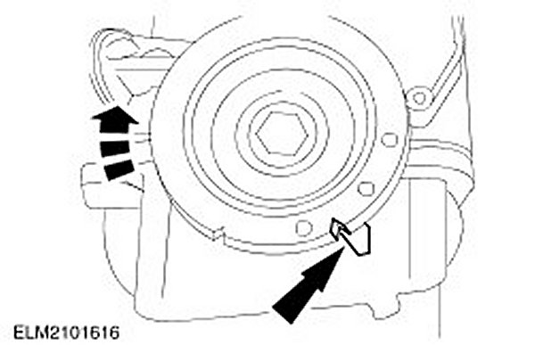 1. Rotate the tensioner locating tab counterclockwise and insert the locating tab into the slot in the rear timing cover.