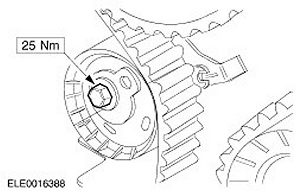 25. NOTE: Use an open ended wrench or suitable pliers to prevent the camshaft rotating from rotating.