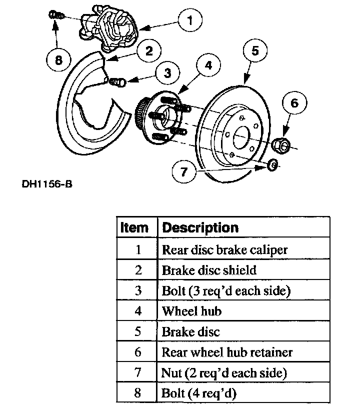 Rear Disc Brake System ComponentsWARNING: Brake fluid contains polyglycol ethers and polyglycols. Avoid contact with eyes. Wash hands thoroughly after handling. If brake fluid contacts eyes, flush eyes with running water for 15 minutes. Get medical attention if irritation persists. If taken internally, drink water and induce vomiting. Get medical attention immediately.
