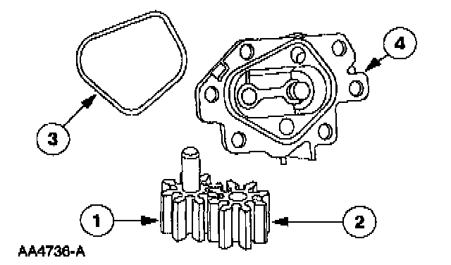 6. Separate the (1) oil pump drive gear, the (2) oil pump driven gear, the (3) oil pump O-ring and the (4) oil pump. Discard the oil pump O-ring.