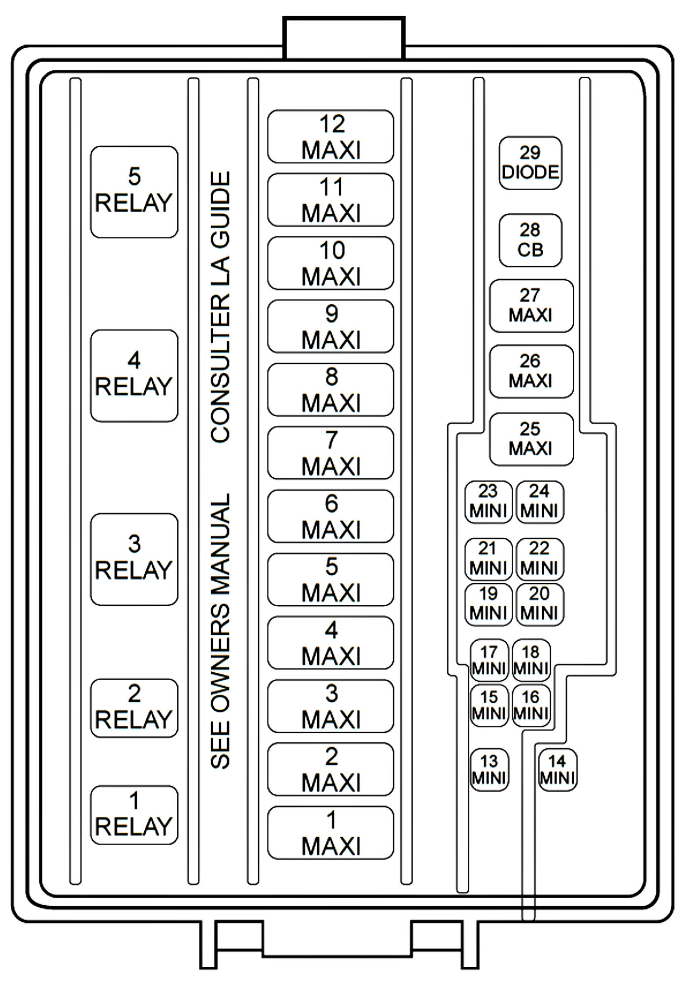 ALLDATA Editor's Note: Ford identifies this one component by 2 different names. Users have reported success comparing these images to determine Application/ID or Location of Fuses and Relays with the Power Distribution Box / Battery Junction Box (BJB).