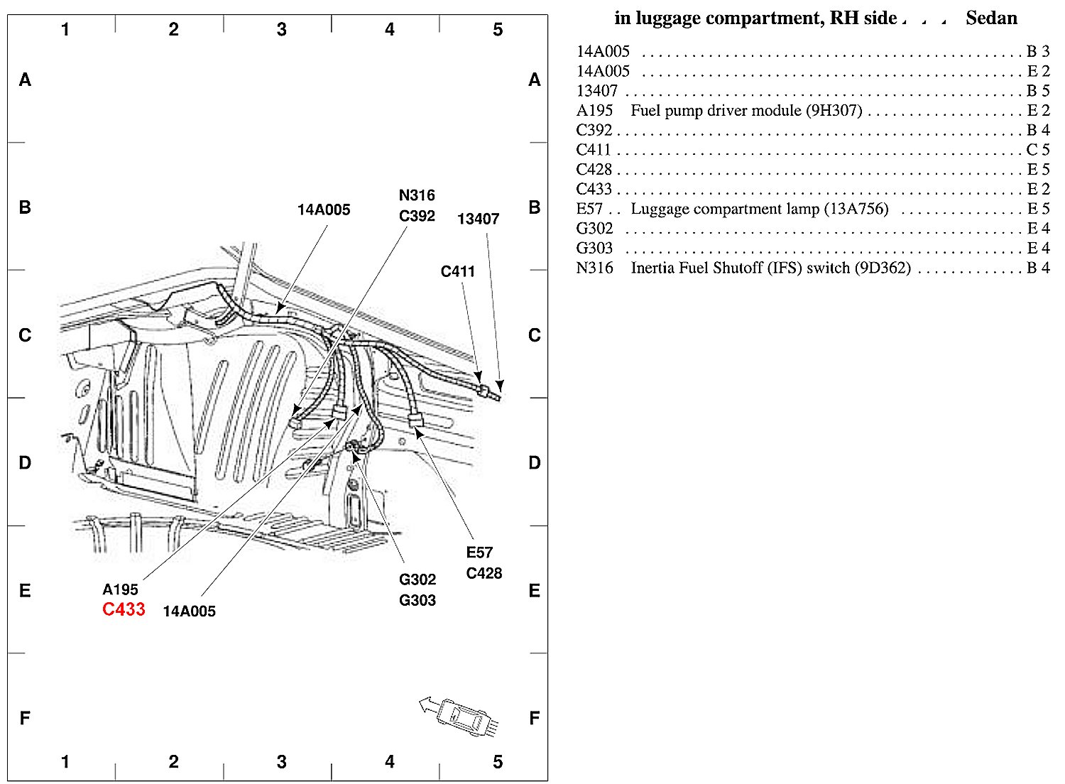 Fuel Pump Driver Module is located in luggage compartment, RH side.