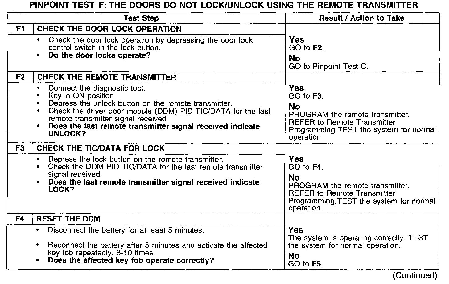 PINPOINT TEST F: THE DOORS DO NOT LOCK/UNLOCK USING THE REMOTE TRANSMITTER