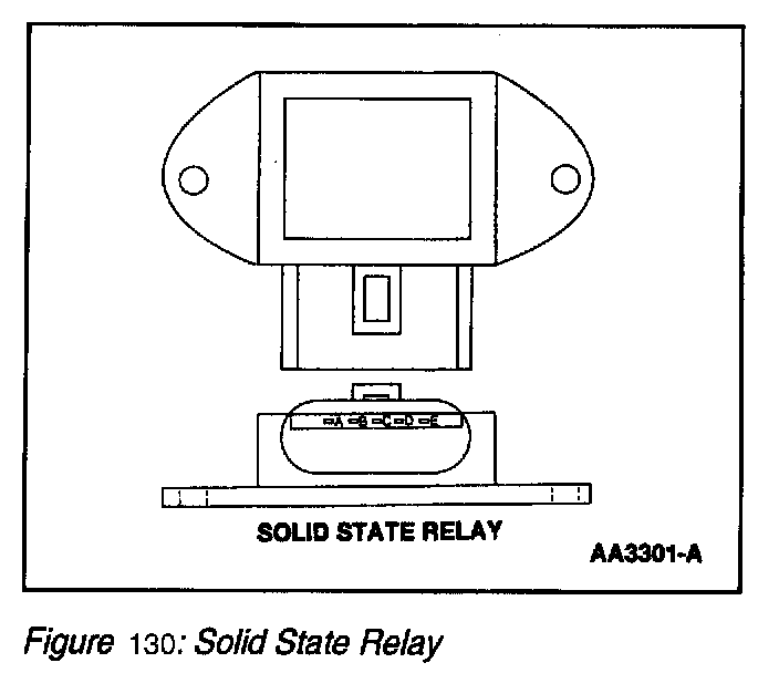 The solid state relay (Figure 129) switches the high current required for operation of the electric AIR pump. Input control to the solid state relay comes from the powertrain control module (PCM).