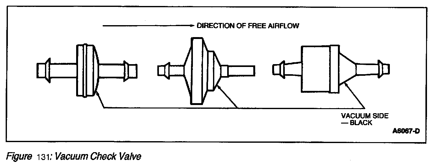 A vacuum check valve (Figure 130) blocks air flow in one direction. It allows free air flow in the other direction. The check side of this valve will hold the highest vacuum registered on the vacuum side.