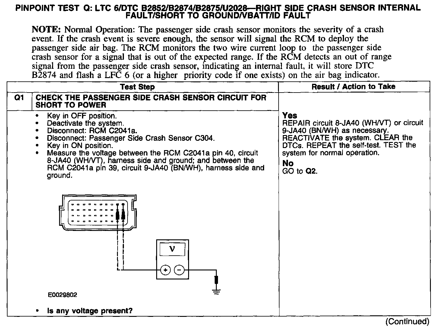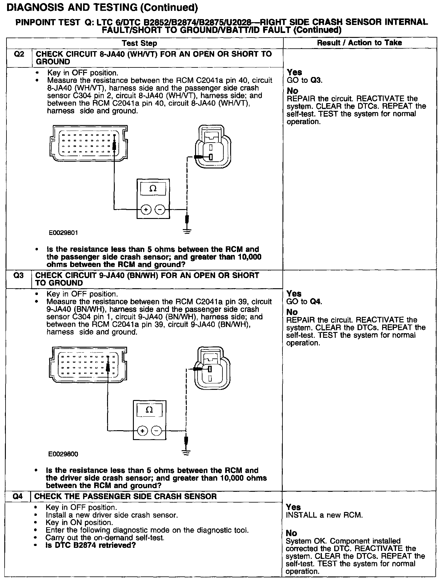 PINPOINT TEST Q: LTC 6/DTC B2852/B2874/B2875/U2028 - RIGHT SIDE CRASH SENSOR INTERNAL FAULT/SHORT TO GROUND/VBATT/ID FAULT