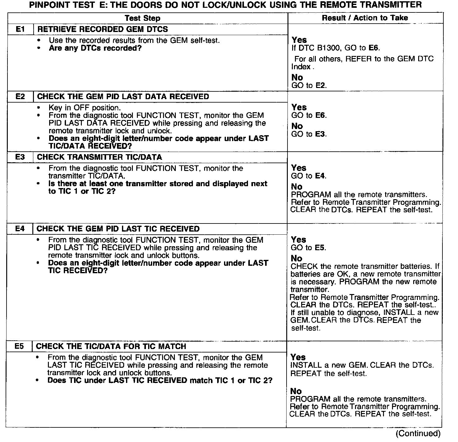 PINPOINT TEST E: THE DOORS DO NOT LOCK/UNLOCK USING THE REMOTE TRANSMITTER