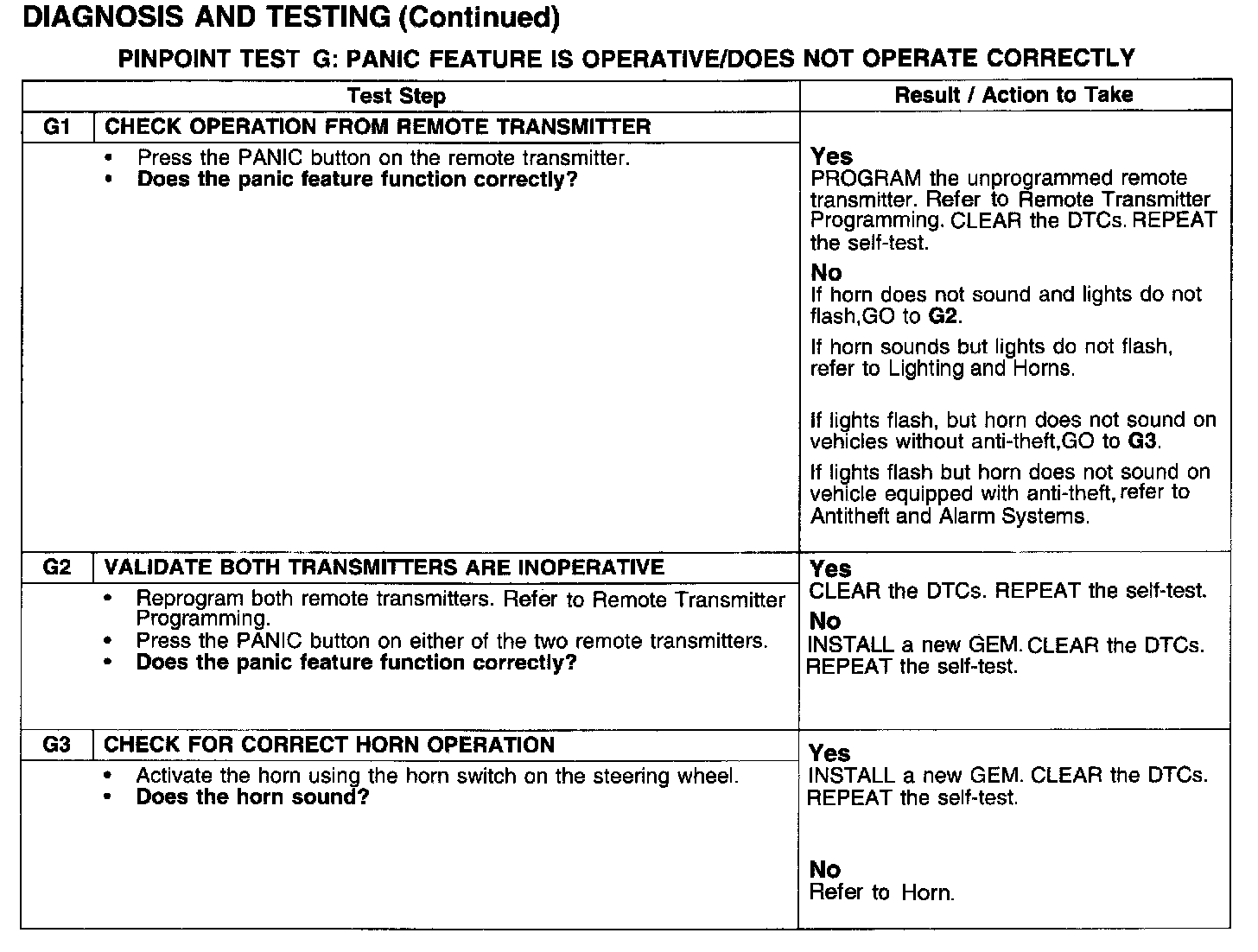 PINPOINT TEST G: PANIC FEATURE IS OPERATIVE/DOES NOT OPERATE CORRECTLY