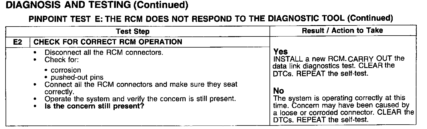 PINPOINT TEST E: THE RCM DOES NOT RESPOND TO THE DIAGNOSTIC TOOL