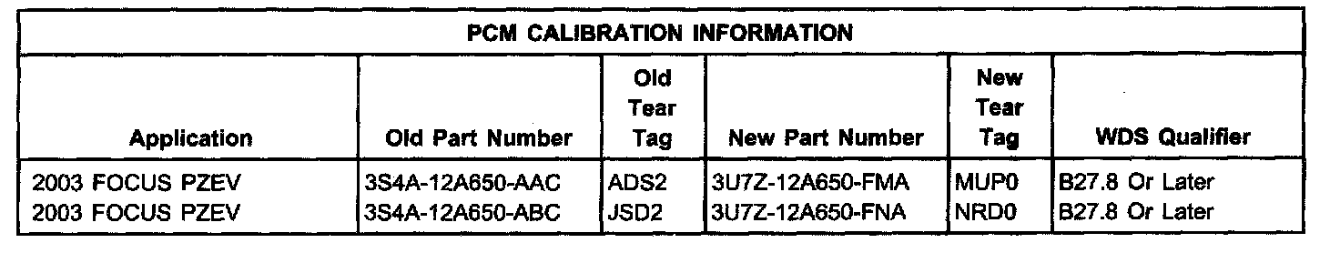Using the Worldwide Diagnostic System (WDS) Reprogram the Powertrain Control Module (PCM). Ensure that the WDS is updated with the Software Version listed in the PCM Calibration Information Chart. Verify that the PCM calibration updates to the level listed.