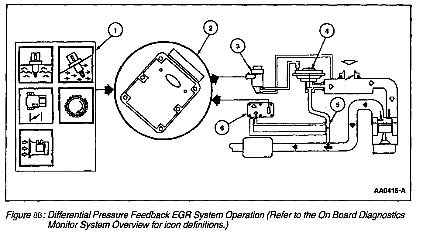 The Differential Pressure Feedback EGR system consists of a differential pressure , EGR vacuum regulator solenoid, EGR valve, orifice tube assembly, Powertrain Control Module (PCM) and connecting wires and vacuum hoses. Operation of the system is as follows (Figure 87):