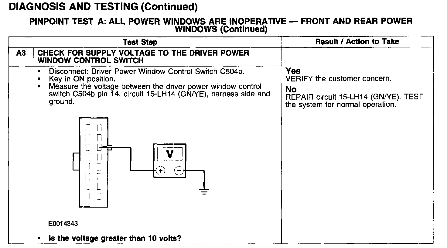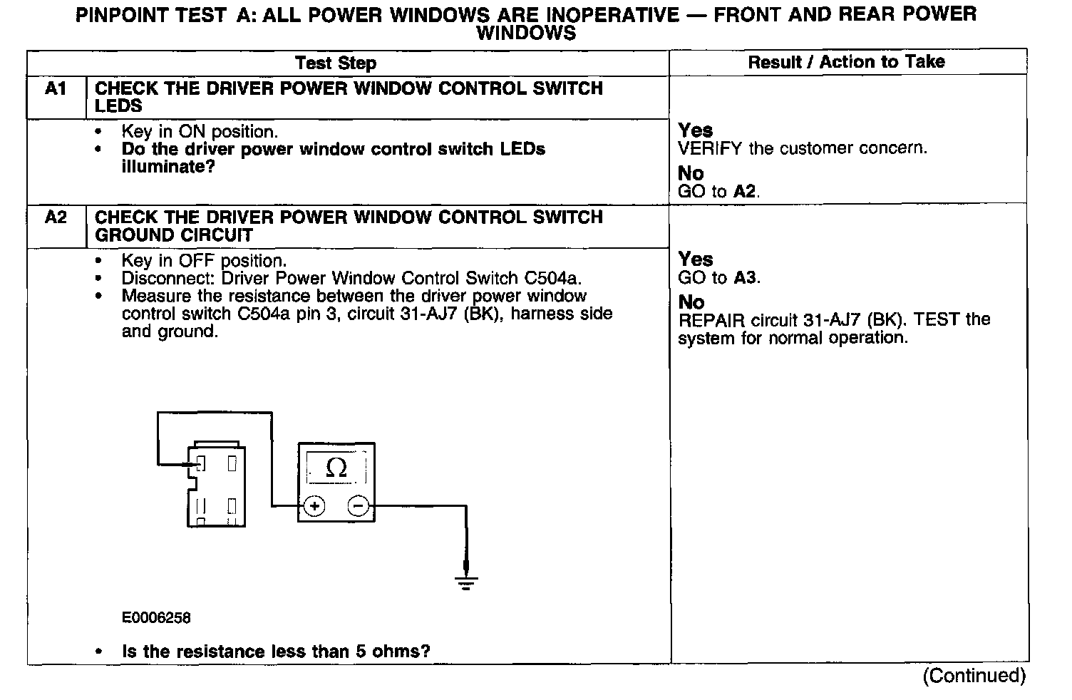PINPOINT TEST A: ALL POWER WINDOWS ARE INOPERATIVE - FRONT AND REAR POWER WINDOWS