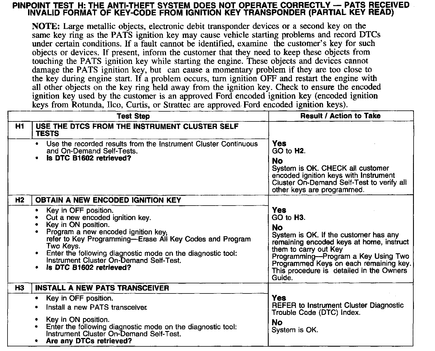 PINPOINT TEST H: THE ANTI-THEFT SYSTEM DOES NOT OPERATE CORRECTLY - PATS RECEIVED INVALID FORMAT OF KEY-CODE FROM IGNITION KEY TRANSPONDER (PARTIAL KEY READ)