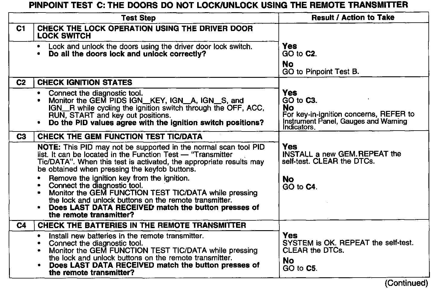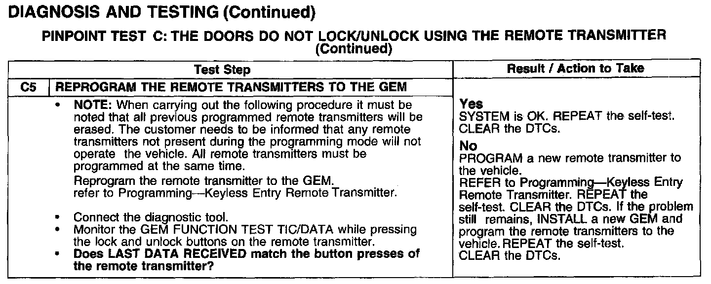 PINPOINT TEST C: THE DOORS DO NOT LOCK/UNLOCK USING THE REMOTE TRANSMITTER