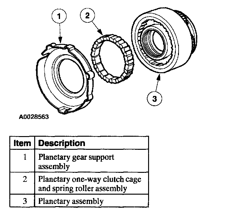 The planetary (low) one-way clutch is a roller clutch that holds the planetary gearset in first gear, (D) and D ranges. During automatic coasting downshifts into first gear ((D) and D ranges), the planetary one-way clutch freewheels so there is no engine braking.