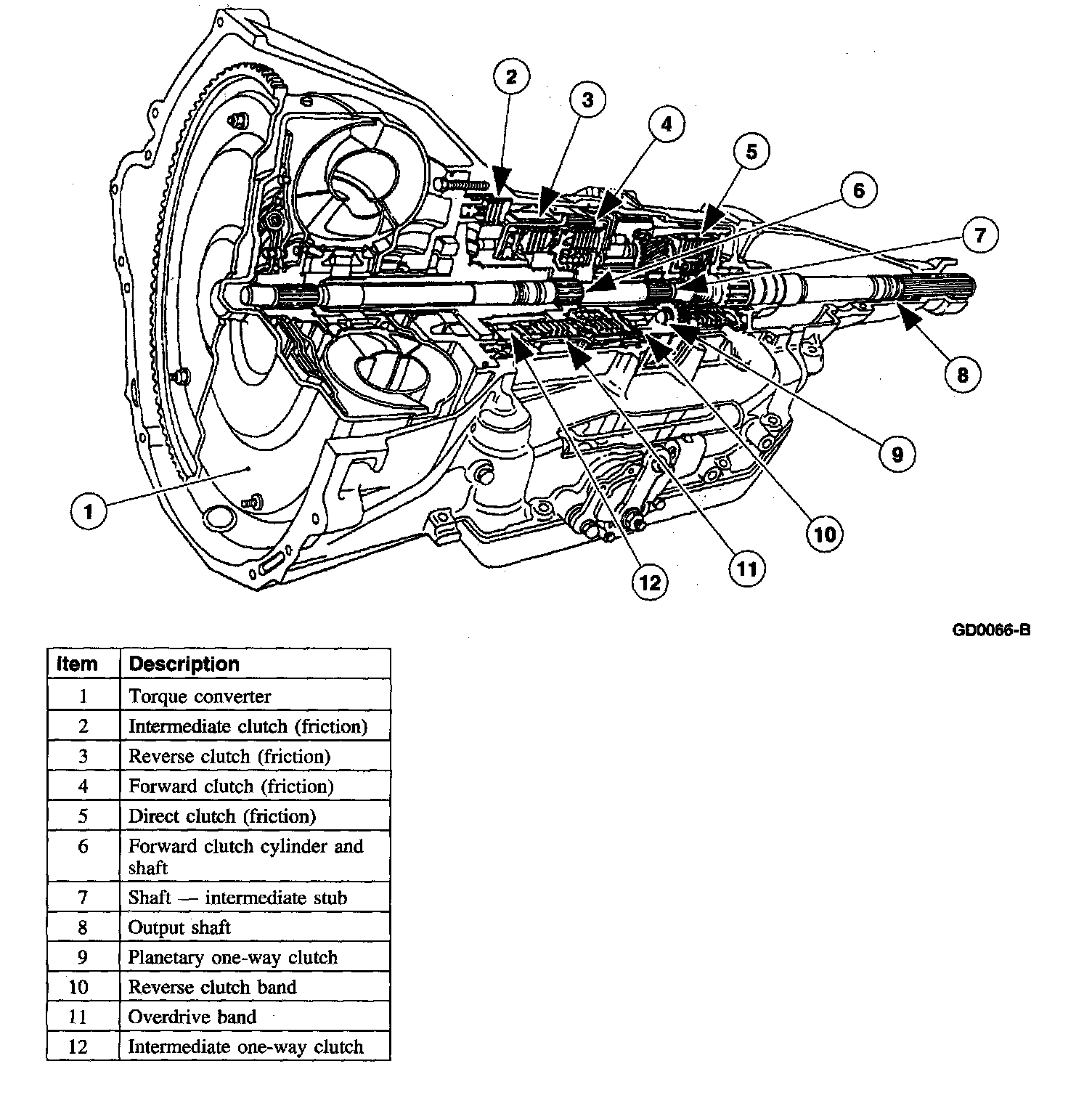 The intermediate one-way clutch works with the intermediate friction clutch to hold the reverse clutch drum and reverse sun gear stationary in second gear during acceleration. The intermediate one-way clutch freewheels in third gear and during coasting in second gear, (D) and D ranges.