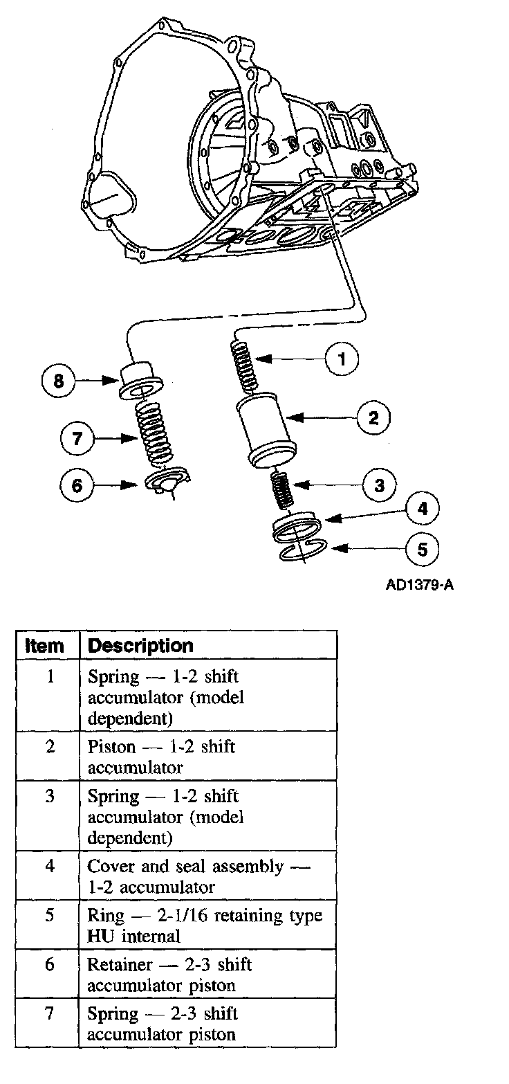 ^ 1-2 Accumulator - The 1-2 accumulator is used to soften the 1-2 shift by absorbing some of the pressure directed to the intermediate clutch. Constant line pressure is applied to the middle section of the 1-2 accumulator piston, opposing the intermediate clutch pressure, until the pressure is high enough to overcome line pressure. The top of the piston is exhausted to the sump.