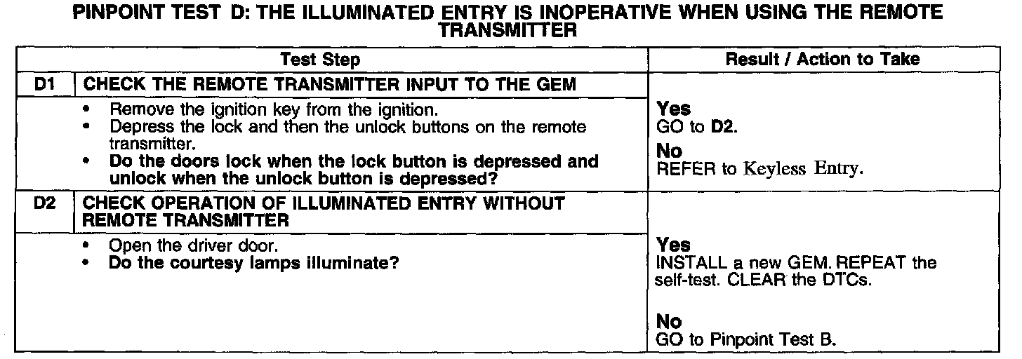 PINPOINT TEST D: THE ILLUMINATED ENTRY IS INOPERATIVE WHEN USING THE REMOTE TRANSMITTER