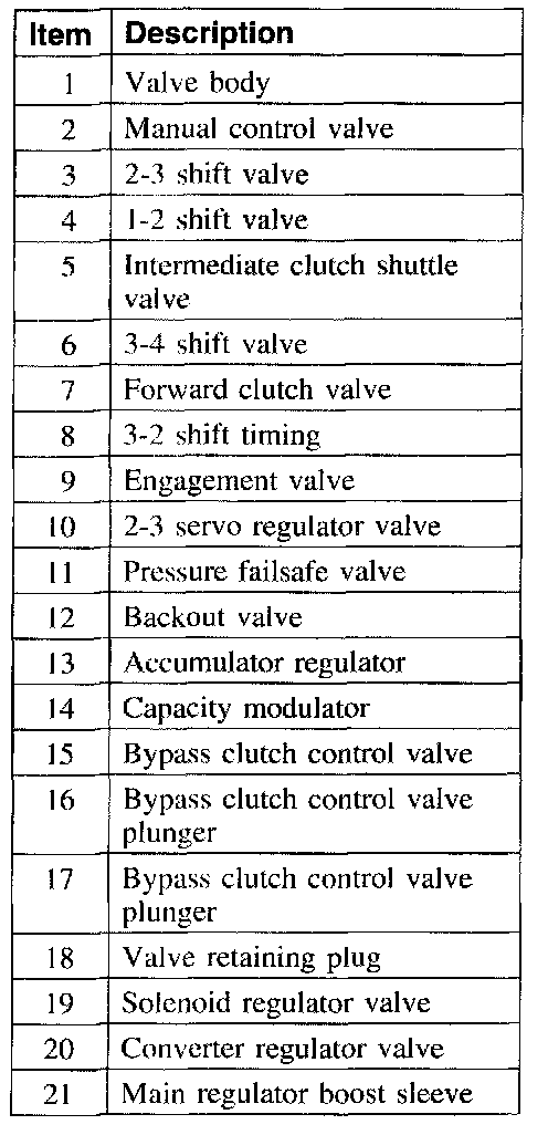 6. CAUTION: Most valves are aluminum and cannot be removed using a magnet. Remove the valves by tapping valve body on the palm of the hand to slide the valves out of the bores. It may be necessary to remove the valves and springs using a pick. If it is necessary to use a pick, use extreme caution to prevent damaging the valves or valve bores. If necessary, disassemble parts of the main control valve body in small groups. Take special care when handling the main control components, since they are the most precise and delicate parts of the transaxle. Neatly arrange the parts as they are removed to avoid mixing similar pieces.