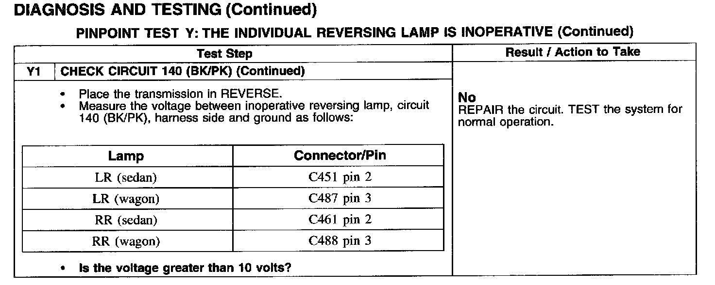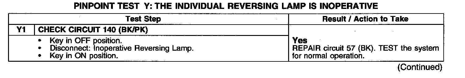 PINPOINT TEST Y: THE INDIVIDUAL REVERSING LAMP IS INOPERATIVE