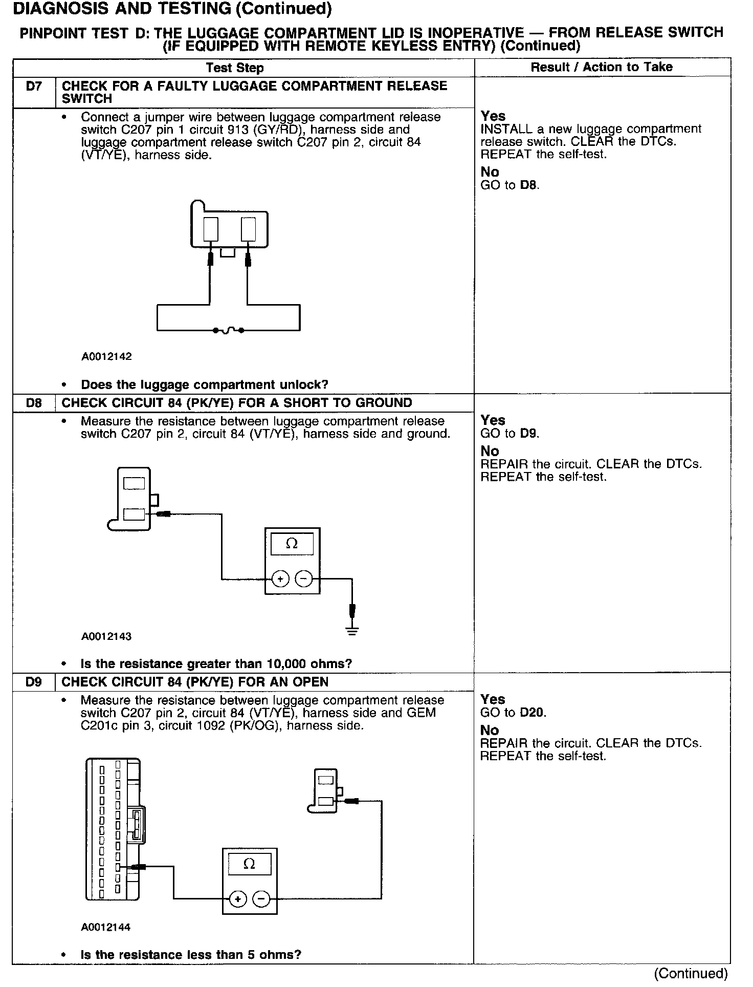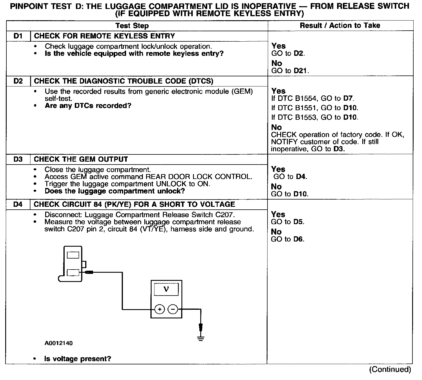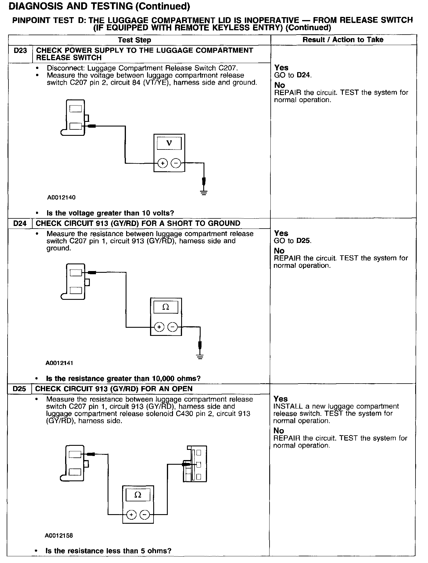 PINPOINT TEST D: THE LUGGAGE COMPARTMENT LID IS INOPERATIVE - FROM RELEASE SWITCH (IF EQUIPPED WITH REMOTE KEYLESS ENTRY)
