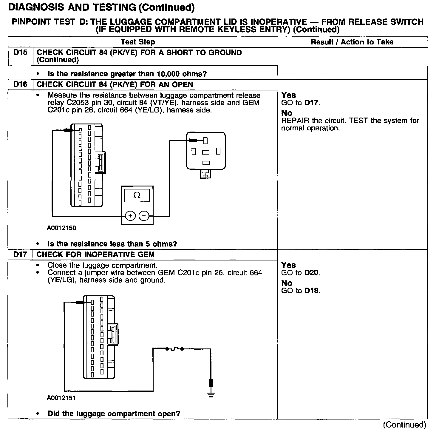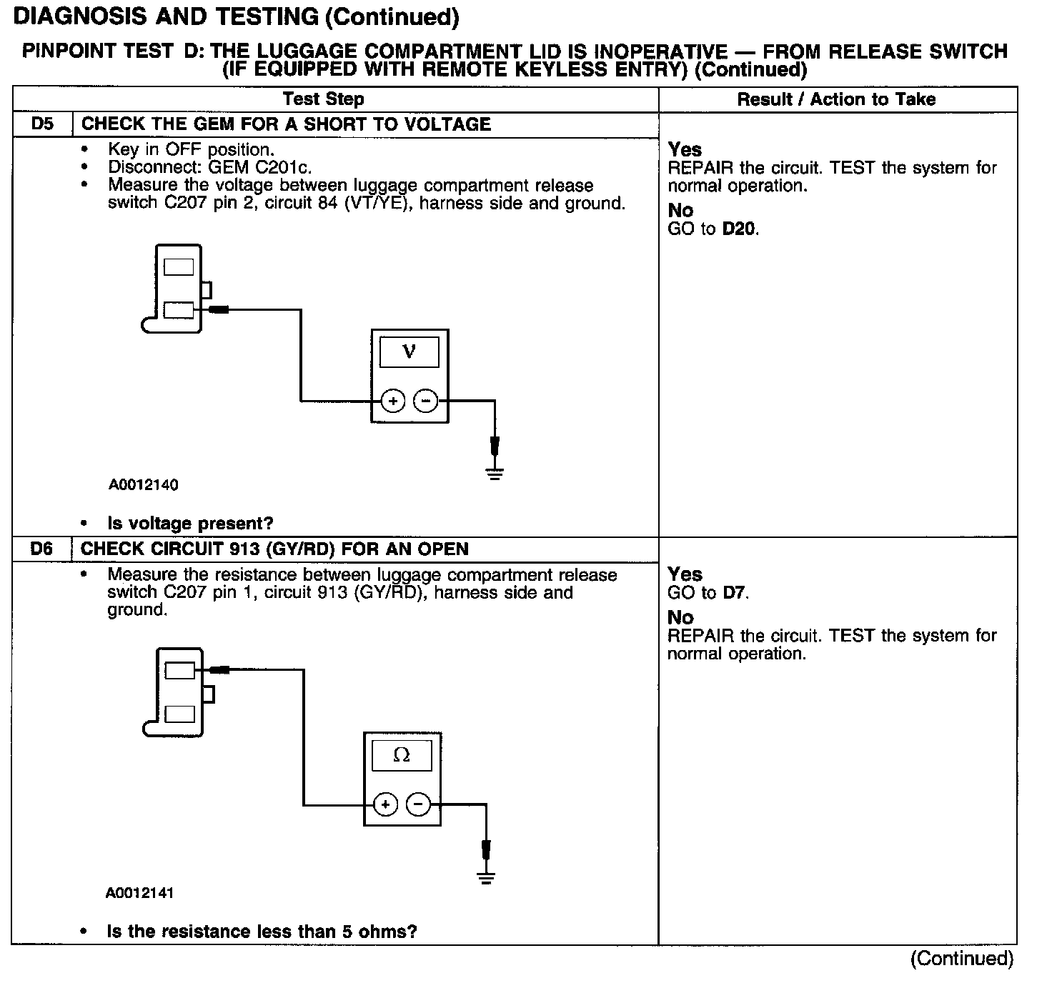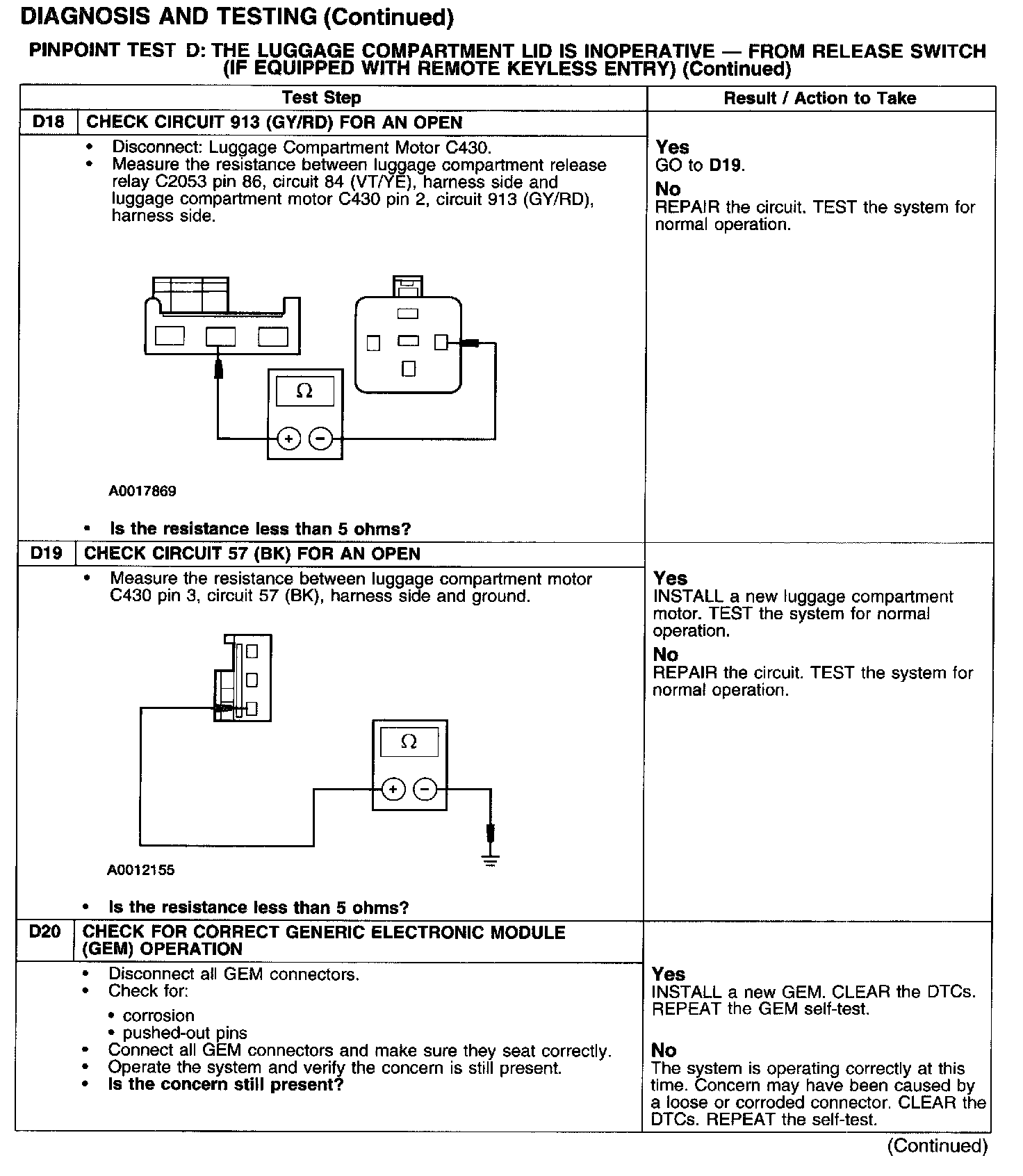 PINPOINT TEST D: THE LUGGAGE COMPARTMENT LID IS INOPERATIVE - FROM RELEASE SWITCH (IF EQUIPPED WITH REMOTE KEYLESS ENTRY)