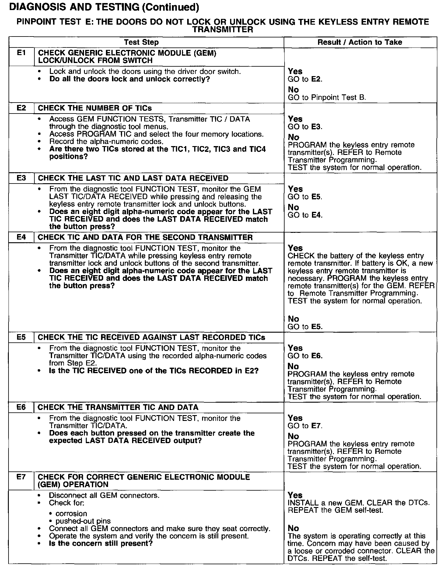 PINPOINT TEST E: THE DOORS DO NOT LOCK OR UNLOCK USING THE KEYLESS ENTRY REMOTE TRANSMITTER