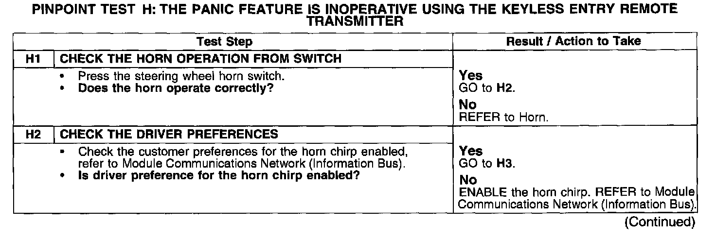 PINPOINT TEST H: THE PANIC FEATURE IS INOPERATIVE USING THE KEYLESS ENTRY REMOTE TRANSMITTER