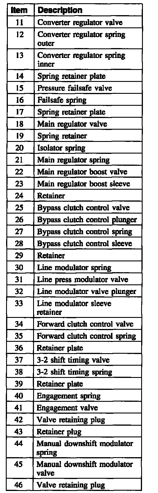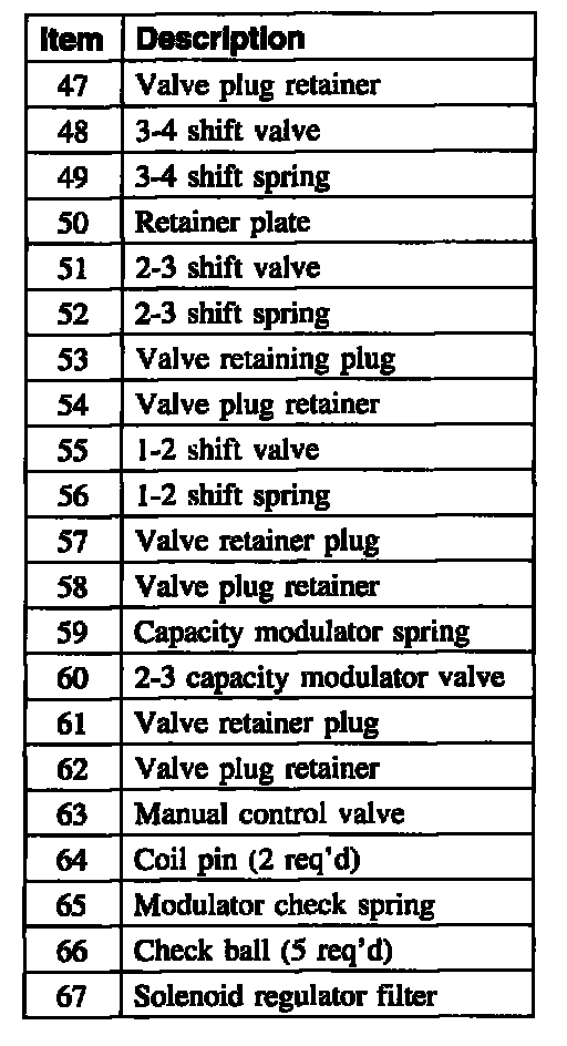 6. CAUTION: Most valves are aluminum and cannot be removed using a magnet. Remove the valves by tapping valve body on the palm of the hand to slide the valves out of the bores. It may be necessary to remove the valves and springs using a pick. If it is necessary to use a pick, use extreme caution to prevent damaging the valves or valve bores. If necessary, disassemble parts of the main control valve body in small groups. Take special care when handling the main control components, since they are the most precise and delicate parts of the transaxle. Neatly arrange the parts as they are removed to avoid mixing similar pieces.