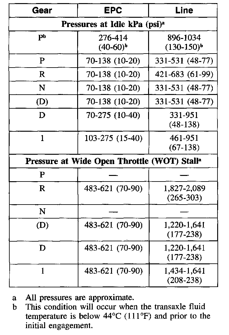 5. Start the engine and check the EPC pressure; refer to the Line Pressure Chart for specifications.