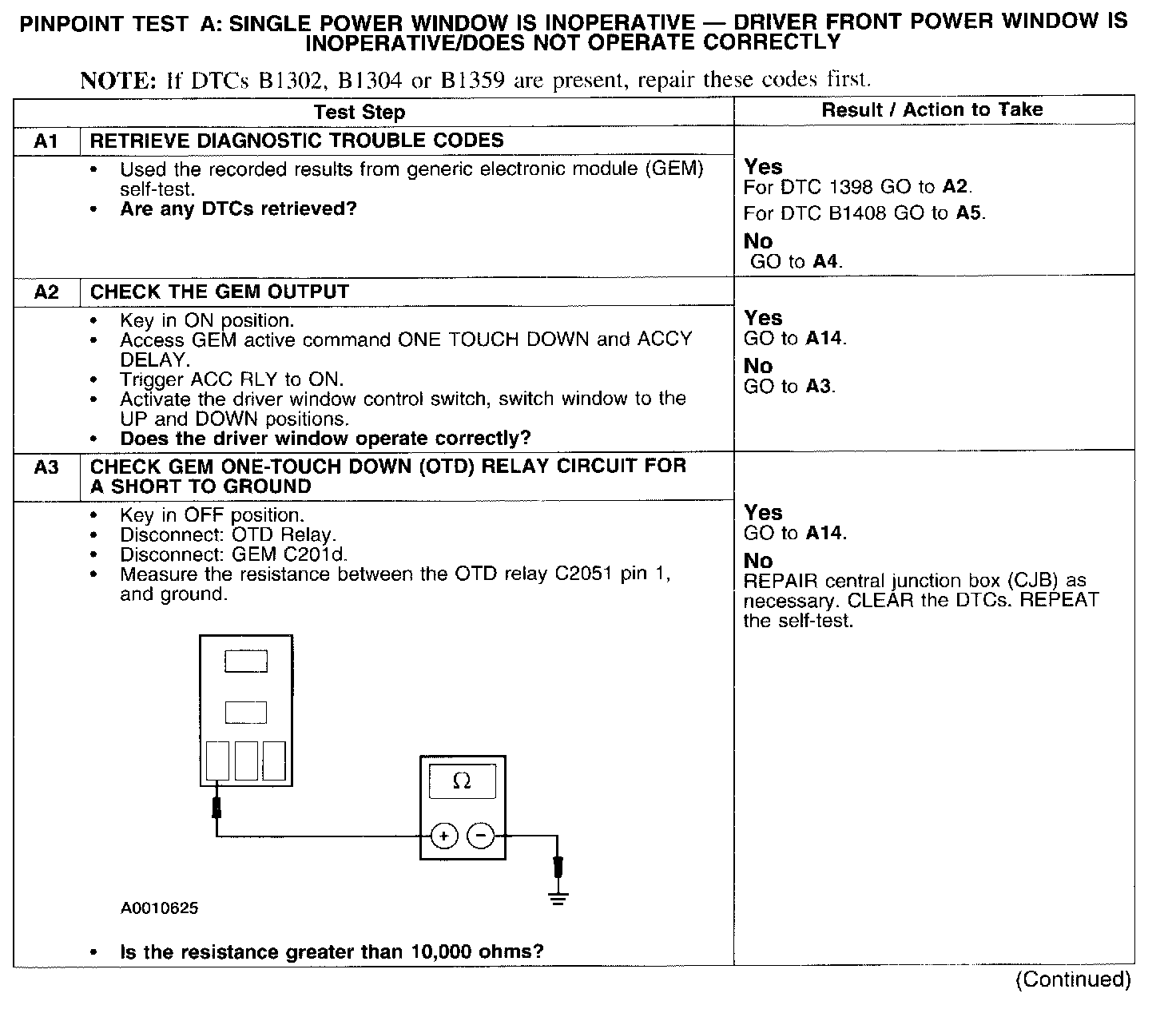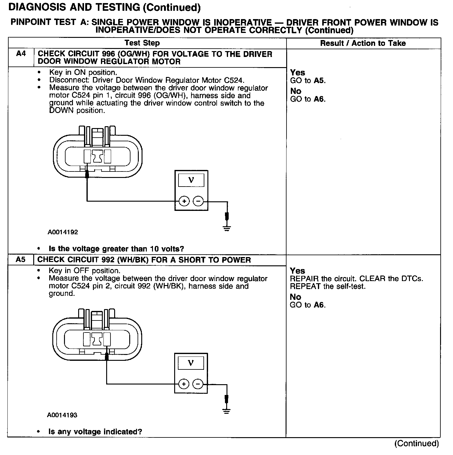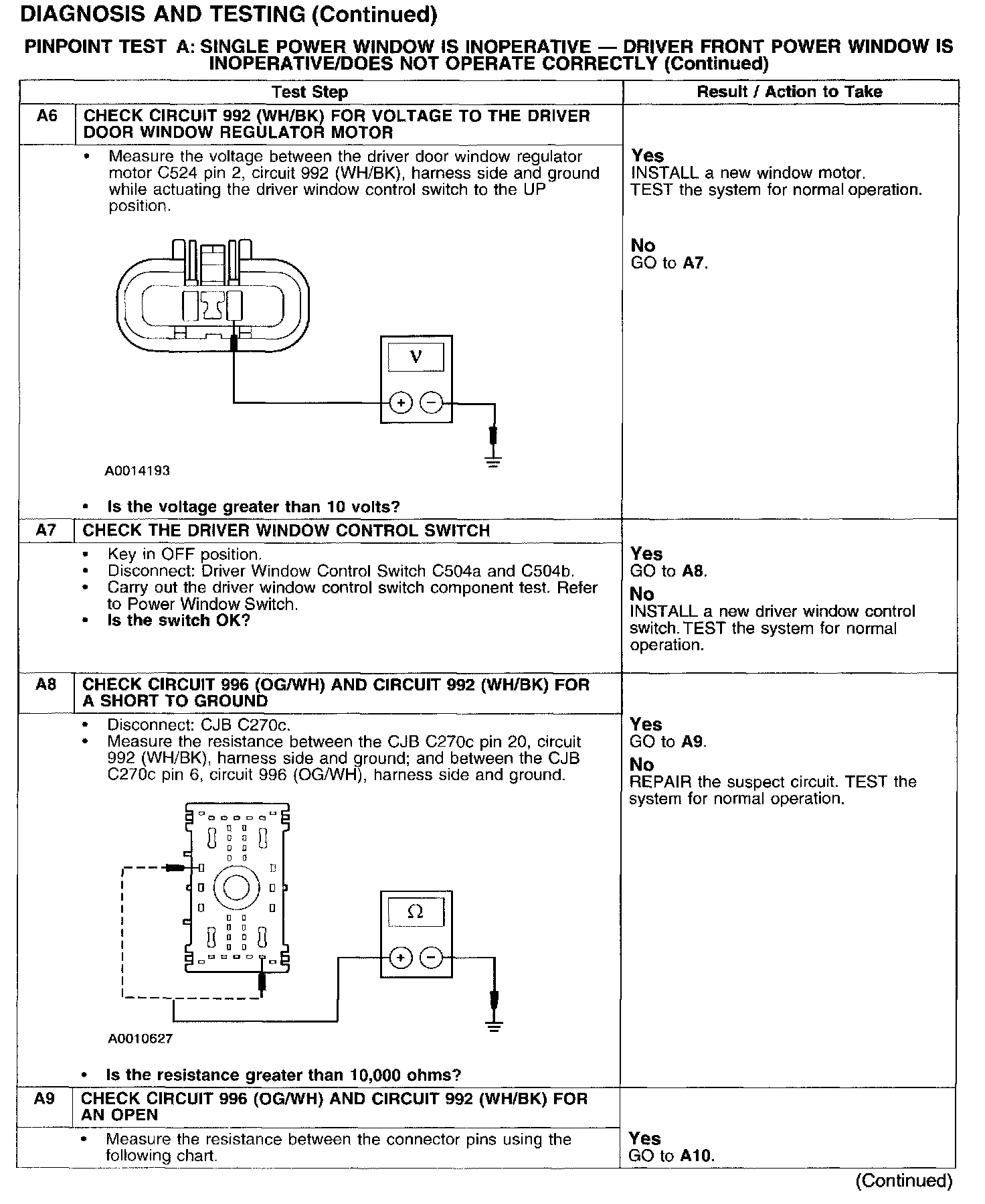 PINPOINT TEST A: SINGLE POWER WINDOW IS INOPERATIVE - DRIVER FRONT POWER WINDOW IS INOPERATIVE/DOES NOT OPERATE CORRECTLY