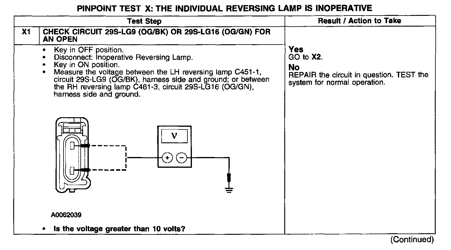 PINPOINT TEST X: THE INDIVIDUAL REVERSING LAMP IS INOPERATIVETest X1: