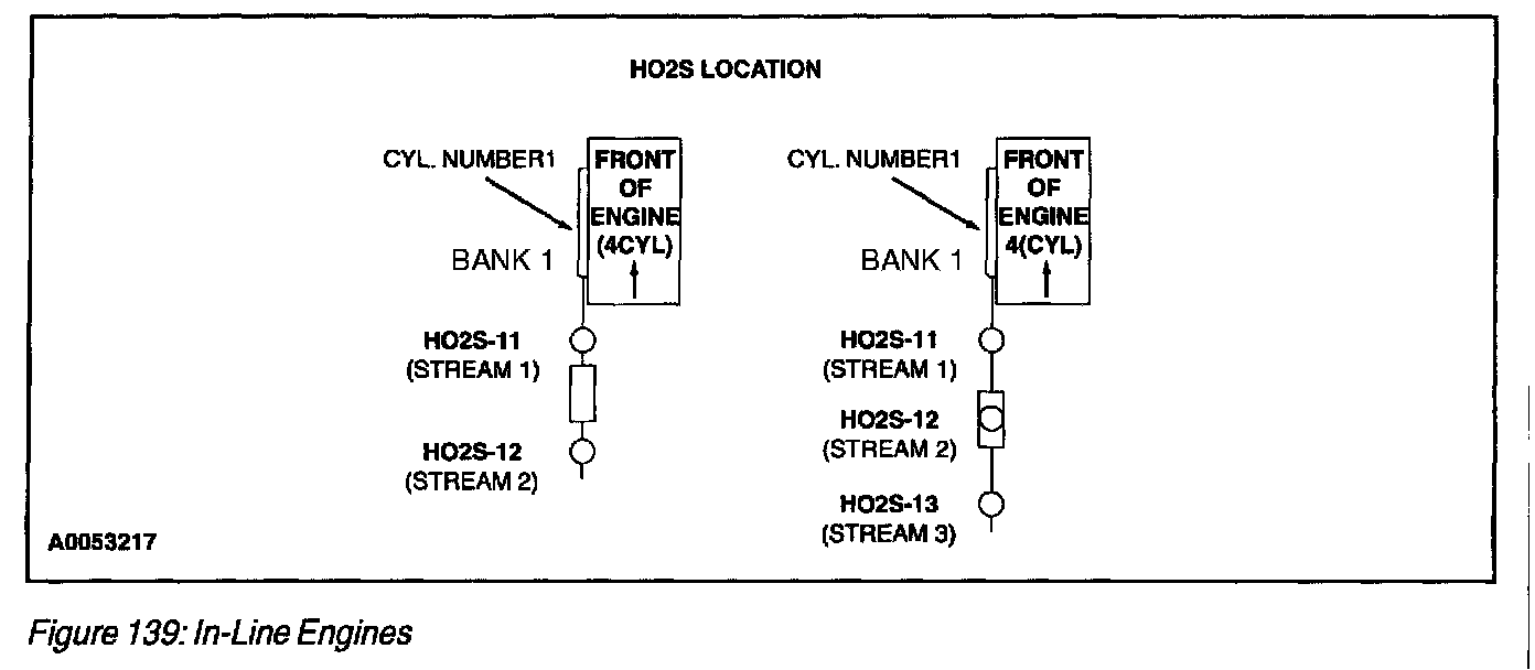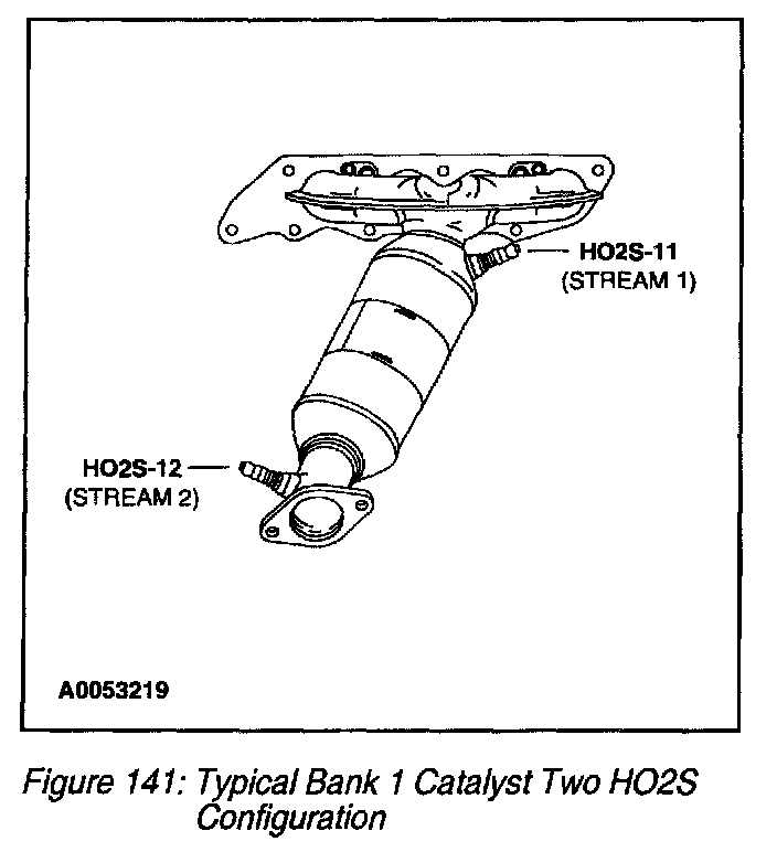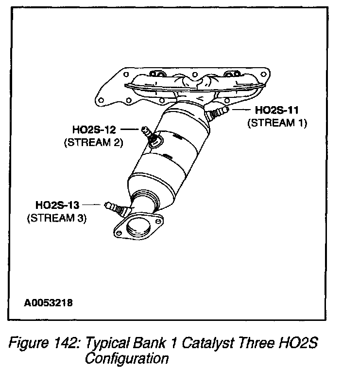 Note on some Partial Zero Emission Vehicles (PZEV), there will be a total of 3 HO2S in the exhaust stream. One near the exhaust manifold (stream 1), one in the middle of the light-off catalyst (stream 2) and the third (stream 3) is mounted after the light-off catalyst (Figure 140).