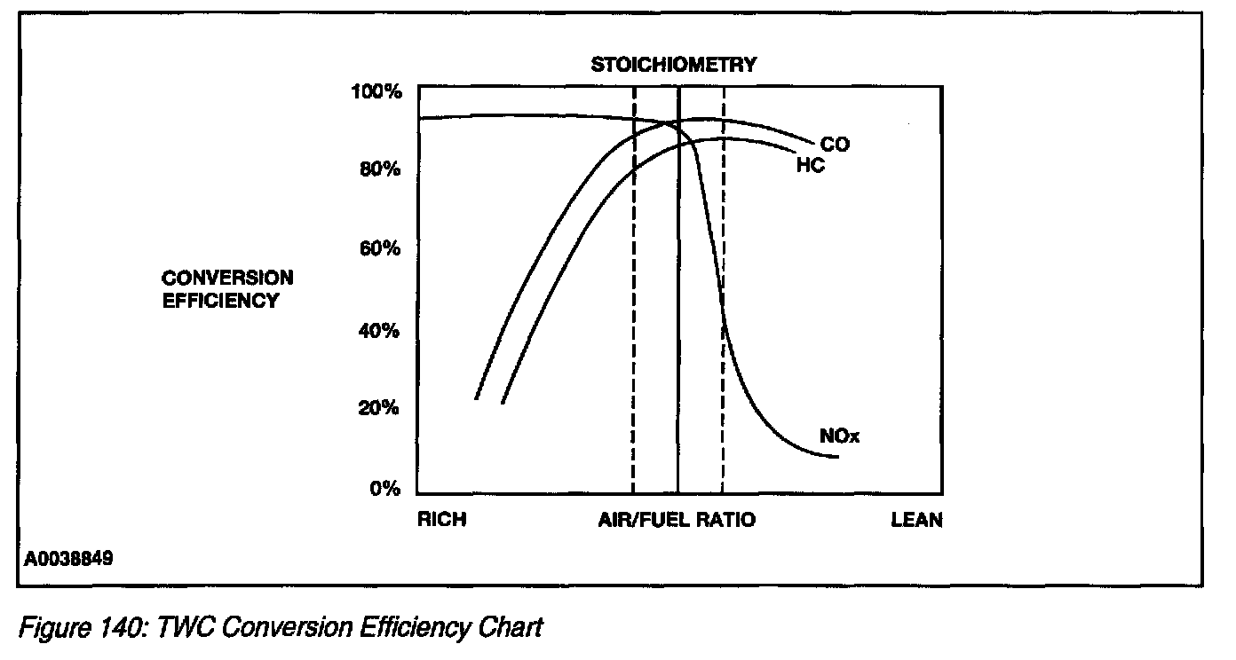 A TWC requires a stoichiometric fuel ratio, 14.7 pounds of air to 1 pound of fuel (14.7:1), for high conversion efficiency. In order to achieve these high efficiencies, the air/fuel ratio must be tightly controlled with a narrow window of stoichiometry. Deviations outside of this window will greatly decrease the conversion efficiency (Figure 138). For example a rich mixture will decrease the HC and CO conversion efficiency while a lean mixture will decreases the NOx conversion efficiency.