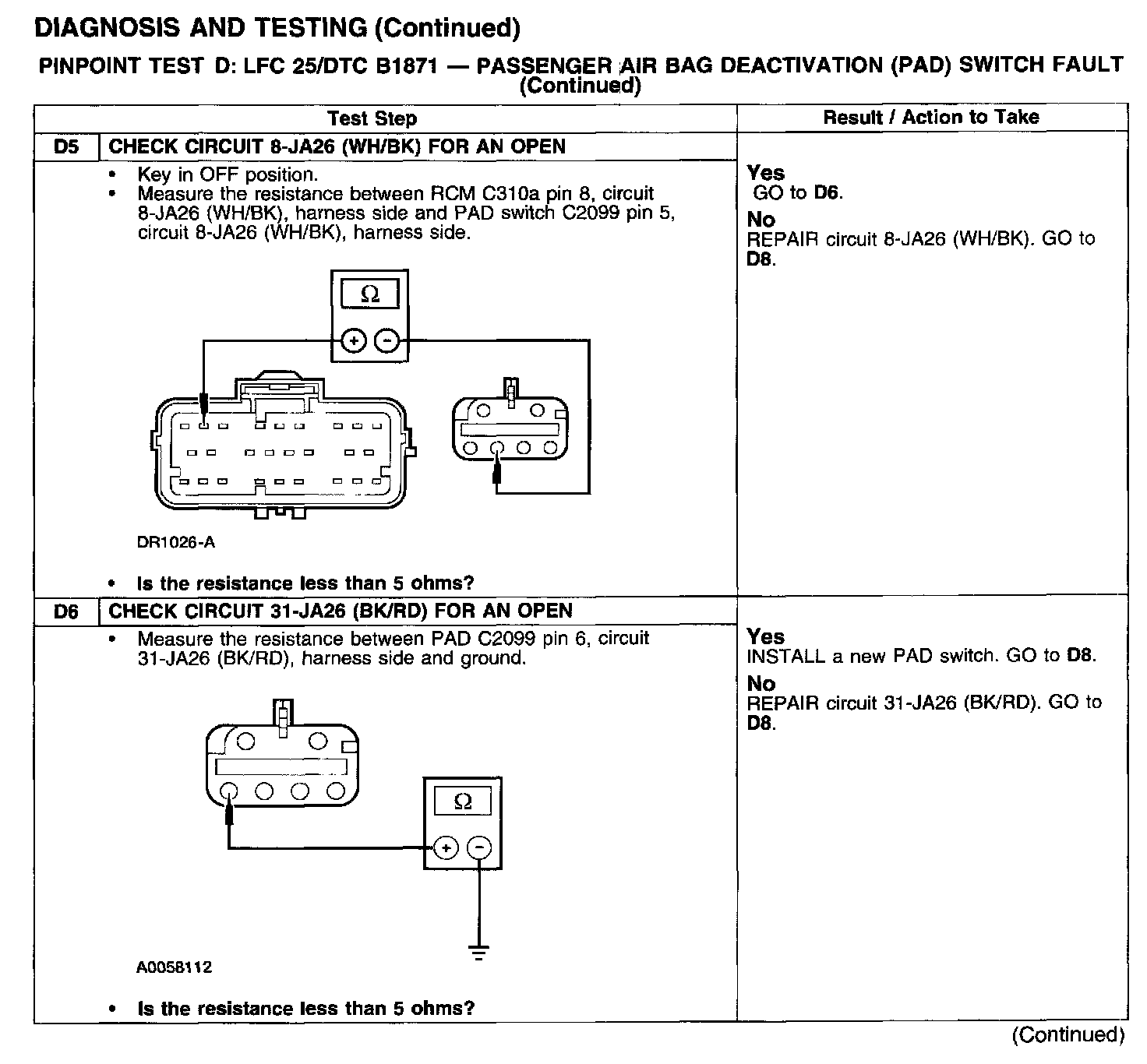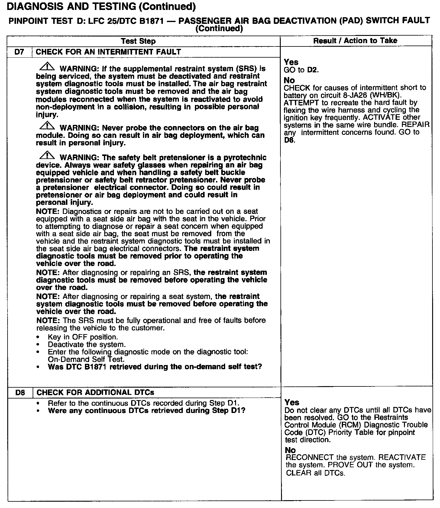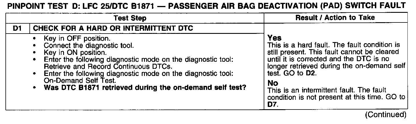PINPOINT TEST D: LFC 25/DTC B1871 - PASSENGER AIR BAG DEACTIVATION (PAD) SWITCH FAULTTest D1: