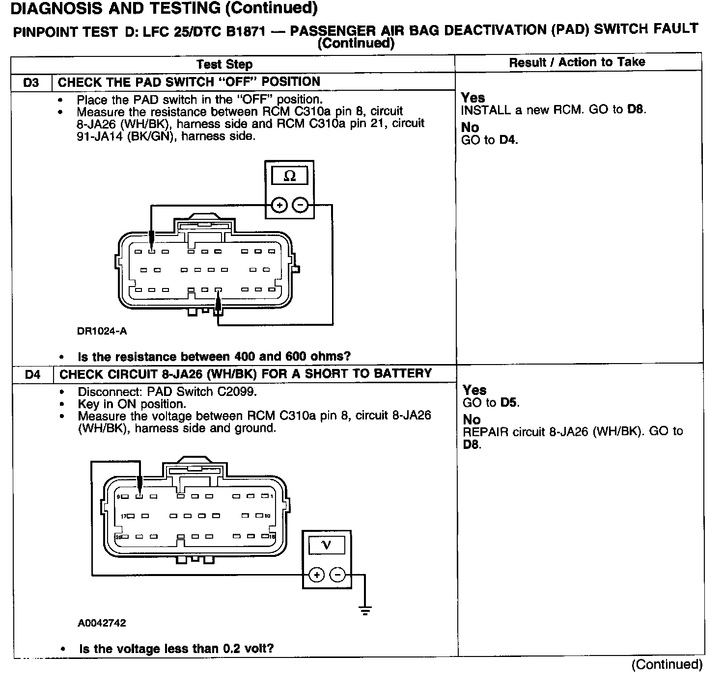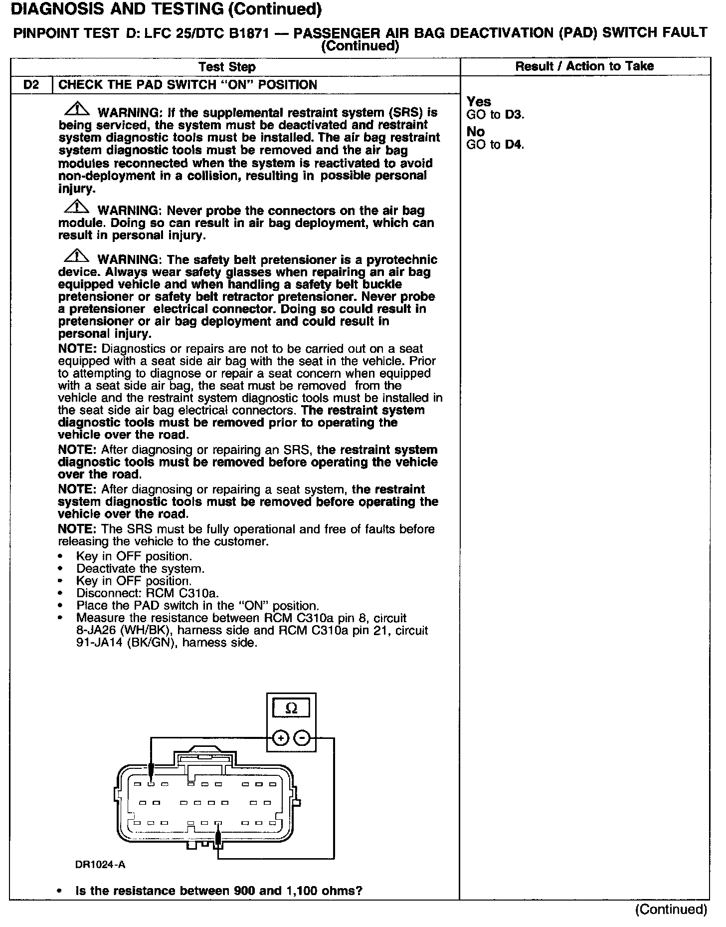 The restraints control module (RCM) monitors the status of the passenger air bag deactivation (PAD) switch at C310a pin 8, circuit 8-JA26 (WH/BK). The PAD switch signals the RCM by switching a resistance to ground. If the RCM senses 900-1,100 ohms in the PAD switch, it enables the passenger air bag and turns off the PAD switch warning lamp. If the RCM senses 400-600 ohms in the PAD switch, it deactivates the passenger air bag and turns the PAD switch warning lamp on. If the RCM detects an invalid resistance, it will store a diagnostic trouble code (DTC) B1871 in memory and flash a lamp fault code (LFC) 25 (or higher priority code if one exists) on the air bag indicator.