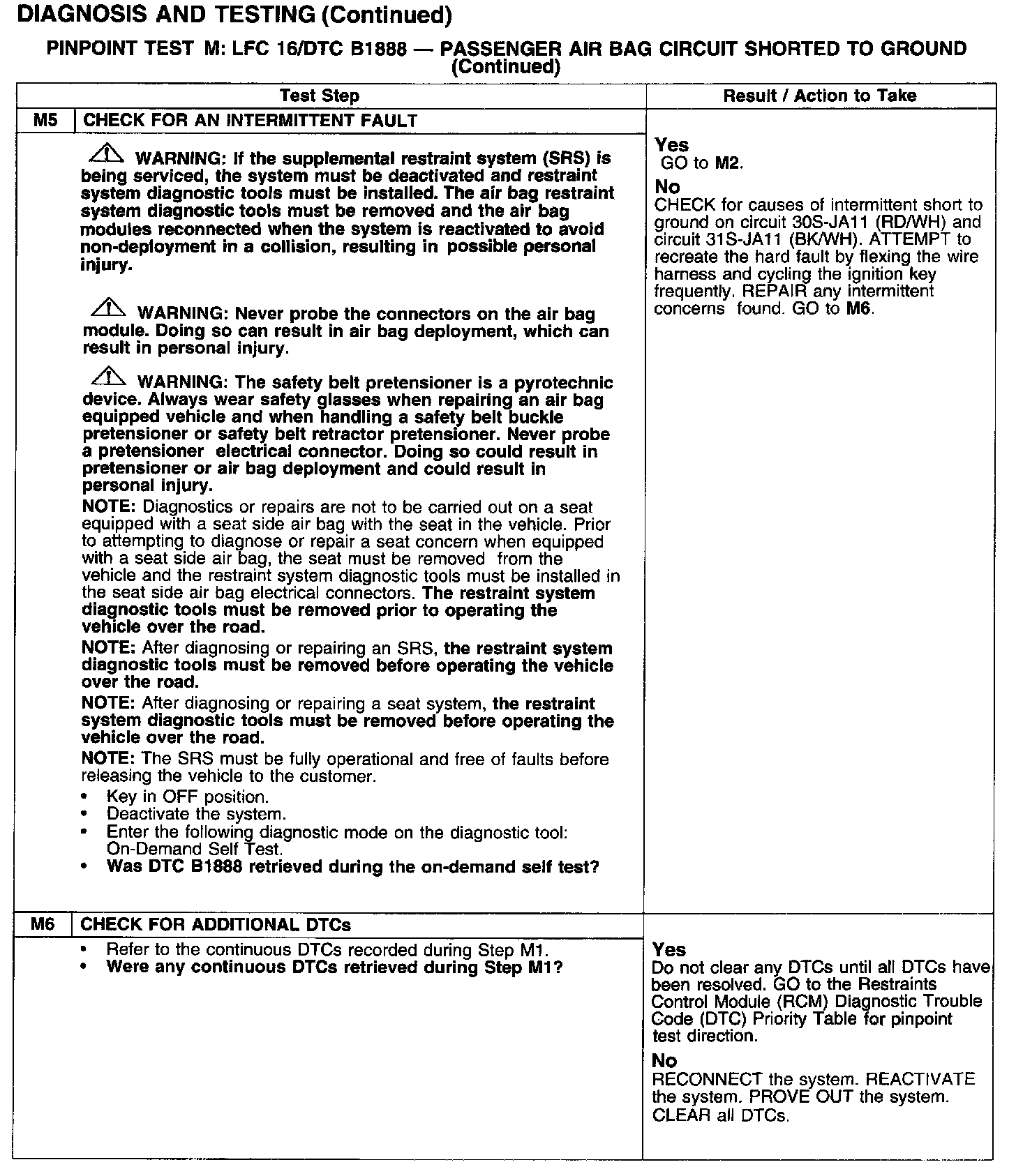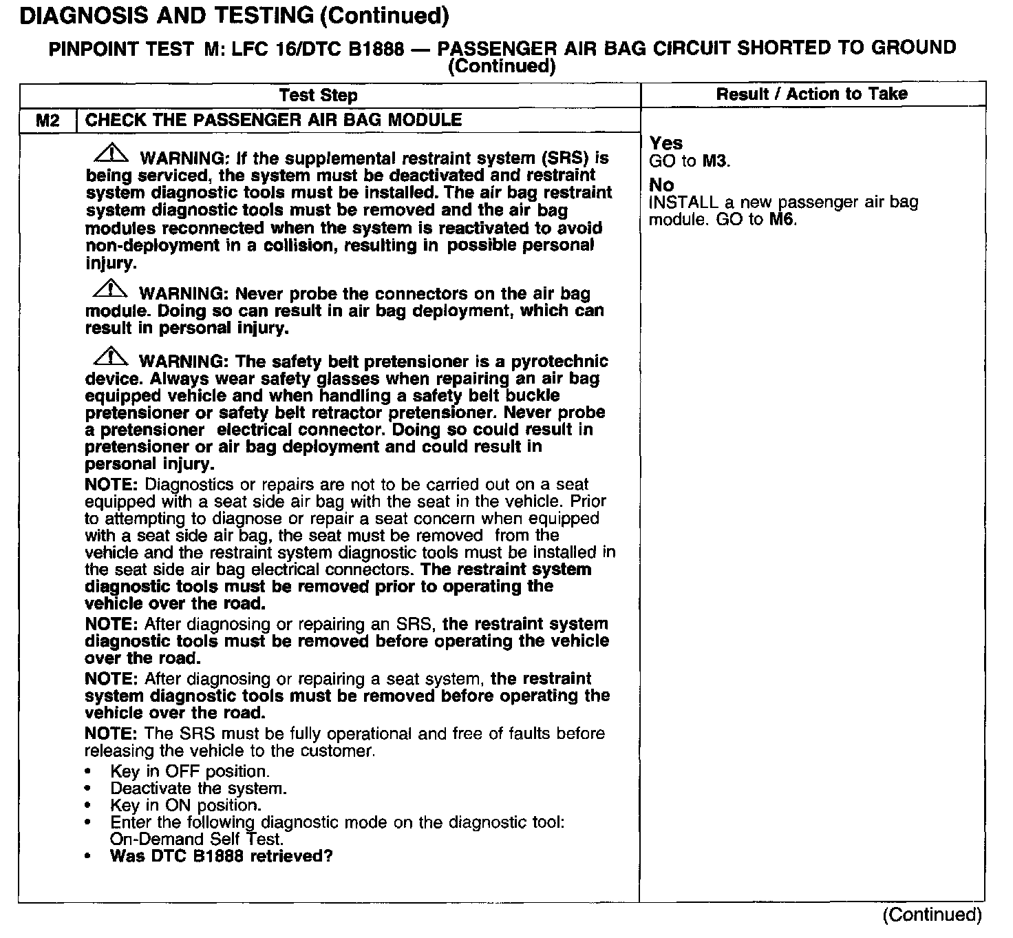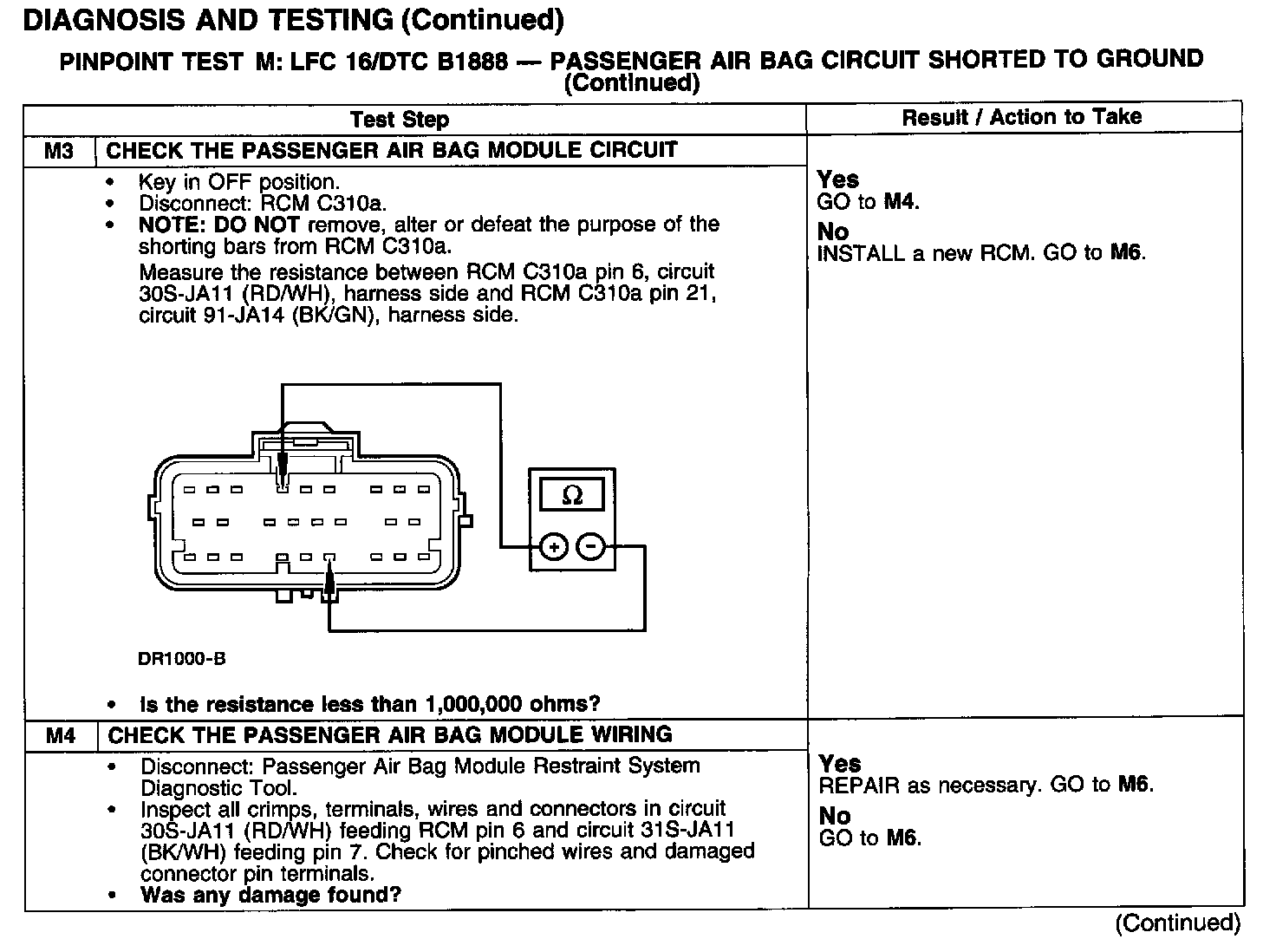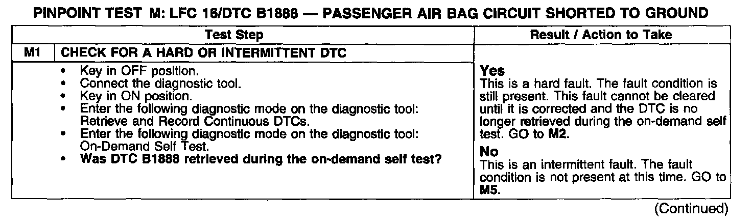PINPOINT TEST M: LFC 16/DTC B1888 - PASSENGER AIR BAG CIRCUIT SHORTED TO GROUNDTest M1: