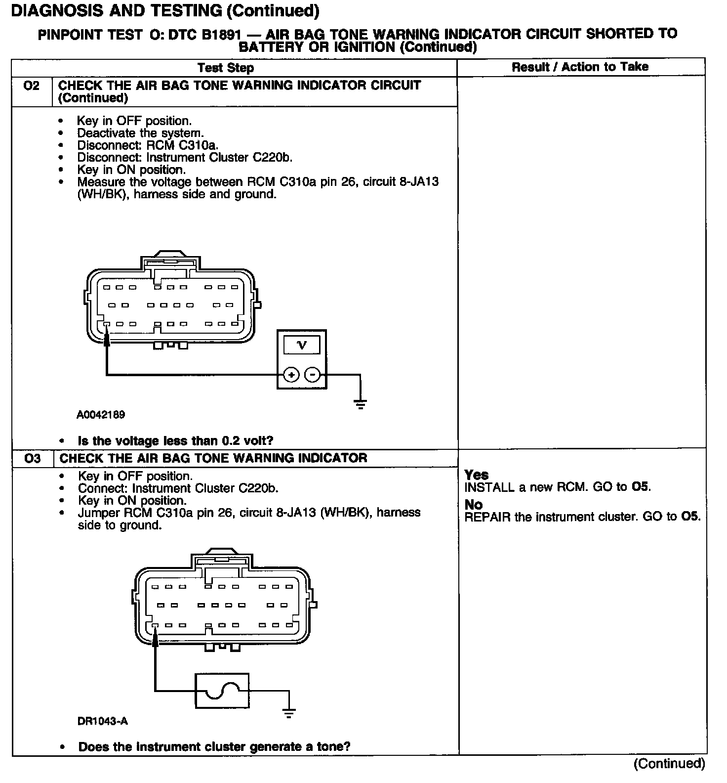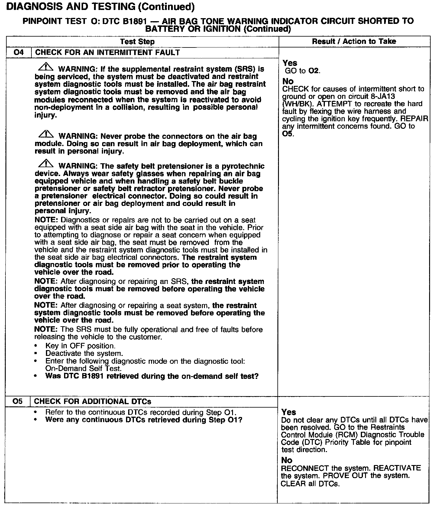 PINPOINT TEST O: DTC B1891 - AIR BAG TONE WARNING INDICATOR CIRCUIT SHORTED TO BATTERY OR IGNITIONTest O1-O2: