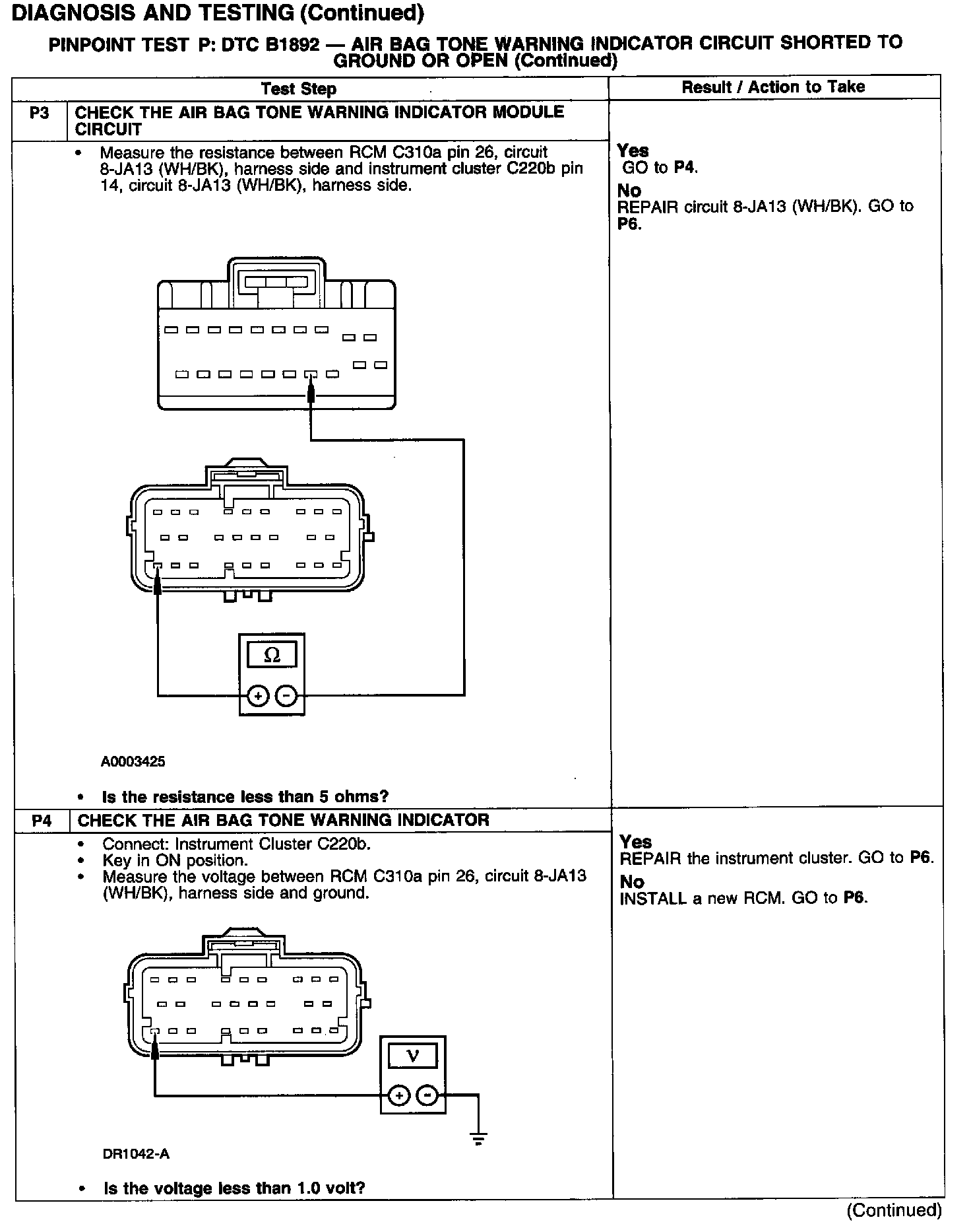 PINPOINT TEST P: B1892 - AIR BAG TONE WARNING INDICATOR CIRCUIT SHORTED TO GROUND OR OPENTest P1:
